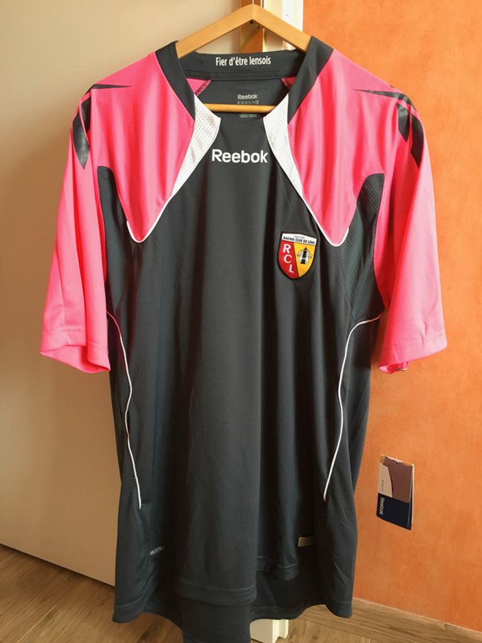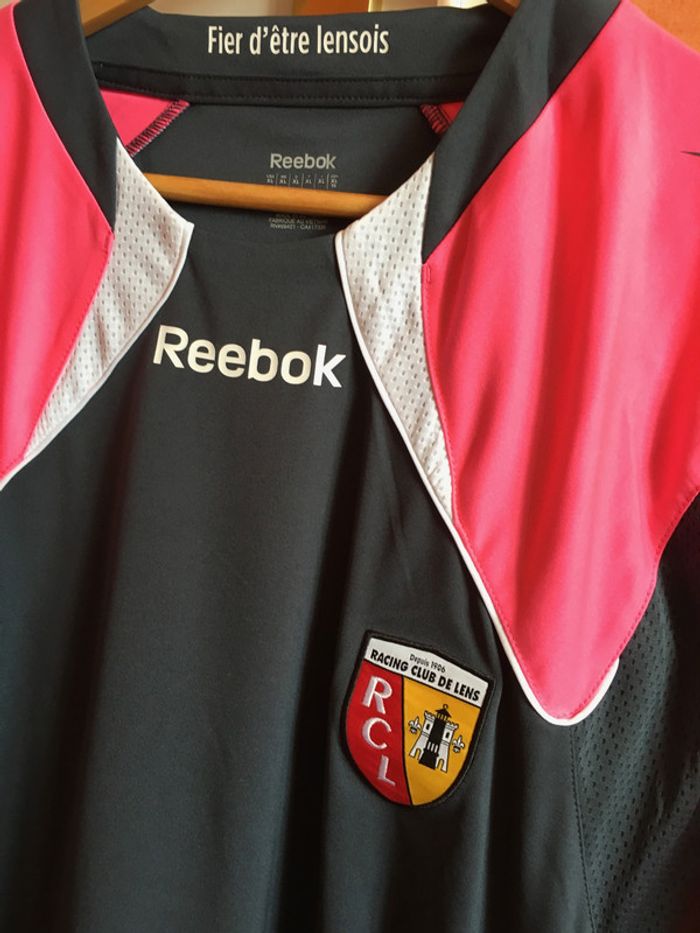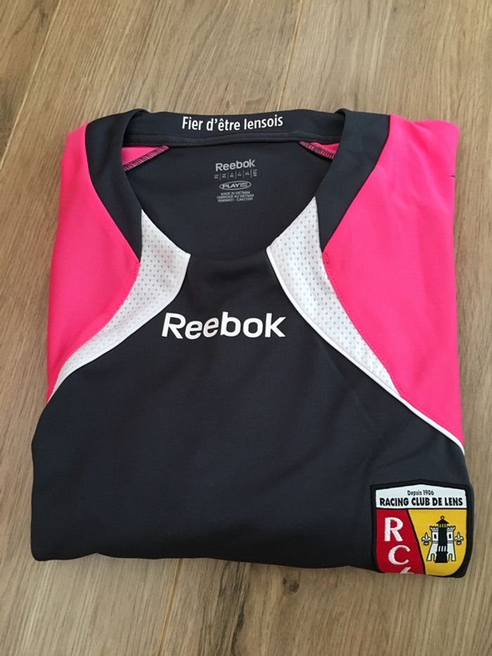 Superbe Maillot de football femme de couleur gris et rose Reebok signé Racing Club de Lens Officiel avec étiquette article neuf taille XL Matière viscose "Play dry"