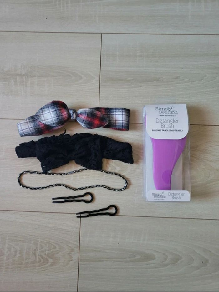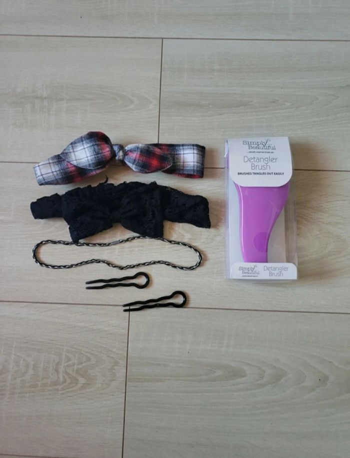Lot pour cheveux 🎀 : - 2 bandeaux élastiques : 1 à carreaux (noir, gris, rouge, blanc) avec 1 noeud en parfait état, 1 en dentelle noir avec 1 noeud (voir photos 3, 4 et 5) en parfait état - 1 headband noir et argenté (voir photo 6) - 2 épingles à cheveux pour chignon en parfait état (voir photo 7) - 1 brosse neuve avec étiquette (voir photos 8 et 9) ⚠️ Ce lot peut être vendu seul ou modifie : me demander ⚠️ D'autres articles de coiffure, beaute, accessoires : #clemencecavaliericoiffure #clemencecavalieribeaute #clemencecavalieriaccessoires