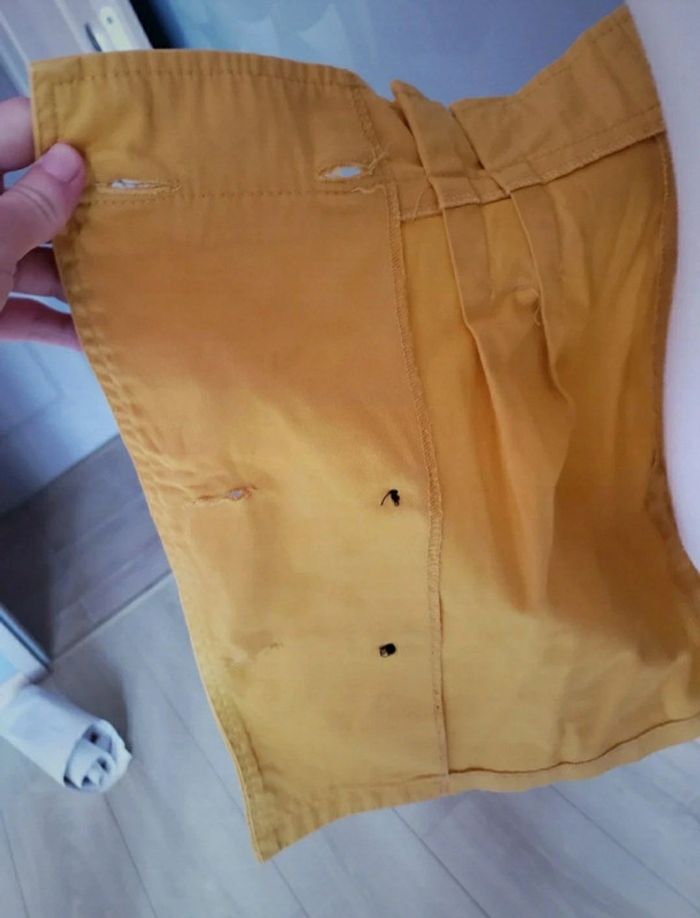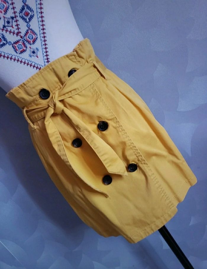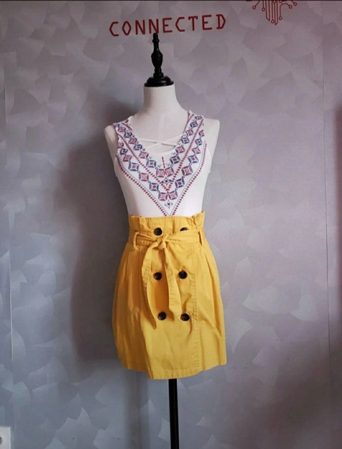 Jupe 🎀 en parfait état Couleurs : moutarde et marron Possibilité d'enlever la ceinture (voir photo 3) Minijupe replissée en haut : c'est normal (voir photo 4) Arrive au dessus du genou Sur les 6 boutons, 2 servent de décorations (voir photos 7 et 8) ⚠ Le haut n'est pas à vendre ⚠ Taille du mannequin : poitrine = 88cm, taille = 64cm, hanches = 83cm ⛔️ Pas de photo porté ⛔️ D’autres vêtements femme taille S : #clemencecavalierifemmeS