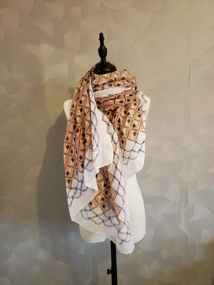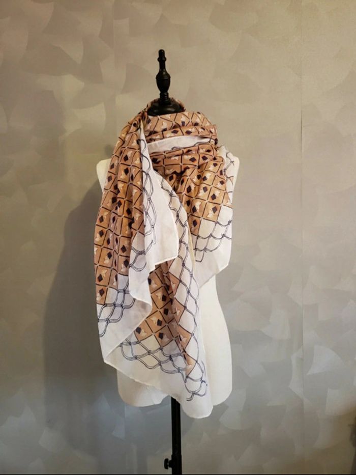Foulard 🎀 en parfait état Couleurs : blanc, pêche, noir, beige et rose Motifs : géométriques (voir photos 4, 5 et 6) Taille du mannequin : poitrine = 88cm, taille = 64cm, hanches = 83cm ⛔️ Pas de photo porté ⛔️ D’autres echarpe et foulard : #clemencecavalieriecharpefoulard