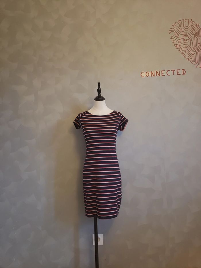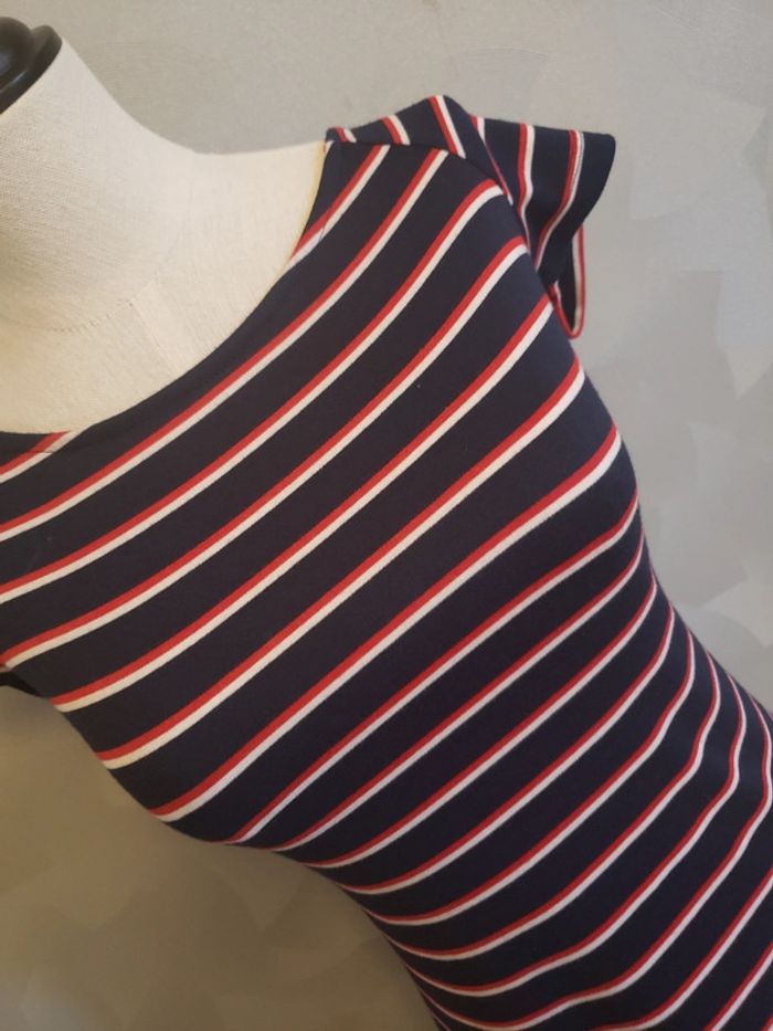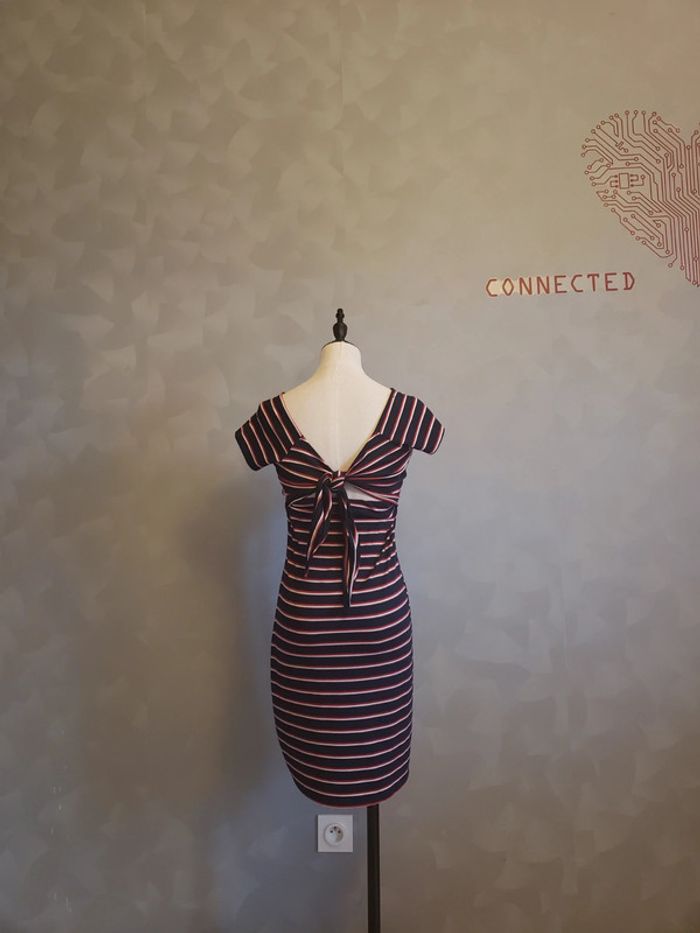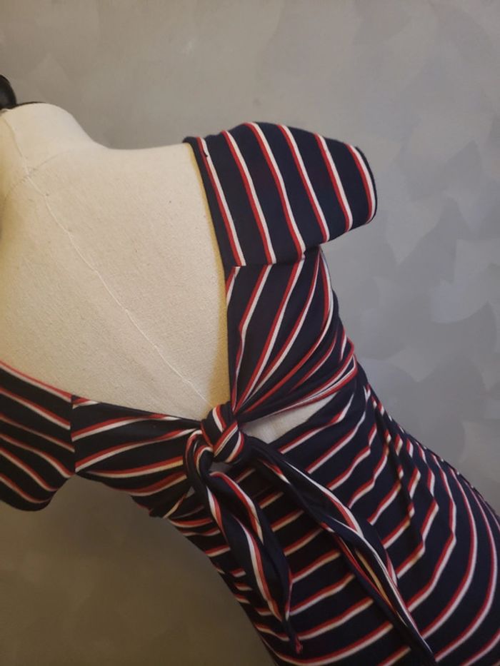 Robe 👗 en parfait état Arrive à peu près au dessus des genoux Couleurs : bleu foncé, rouge et blanc Motif : rayure Manches courtes Noeud à nouer au dos (voir photos 3 et 4) Robe 👗 moulante Taille du mannequin : poitrine = 88cm, taille = 64cm, hanches = 83cm ⛔ Pas de photo porté ⛔ D'autres vêtements femme taille M : #clemencecavalierifemmeM