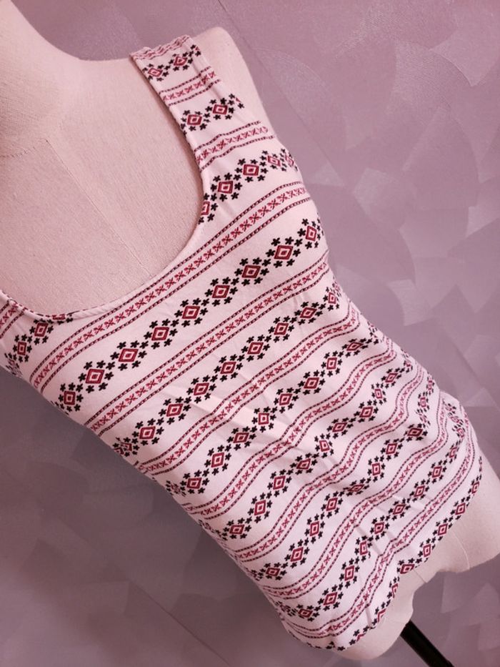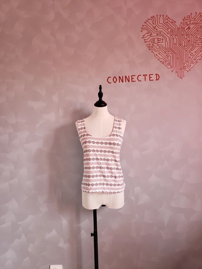 Débardeur 🎀 en parfait état Motifs géométriques Couleurs : blanc, rouge, noir Col rond Croisé à l'arrière + décolleté rond (voir photo 4) Taille du mannequin : poitrine = 88cm, taille = 64cm, hanches = 83cm ⛔ Pas de photo porté ⛔ D'autres vêtements femme taille M : #clemencecavalierifemmeM