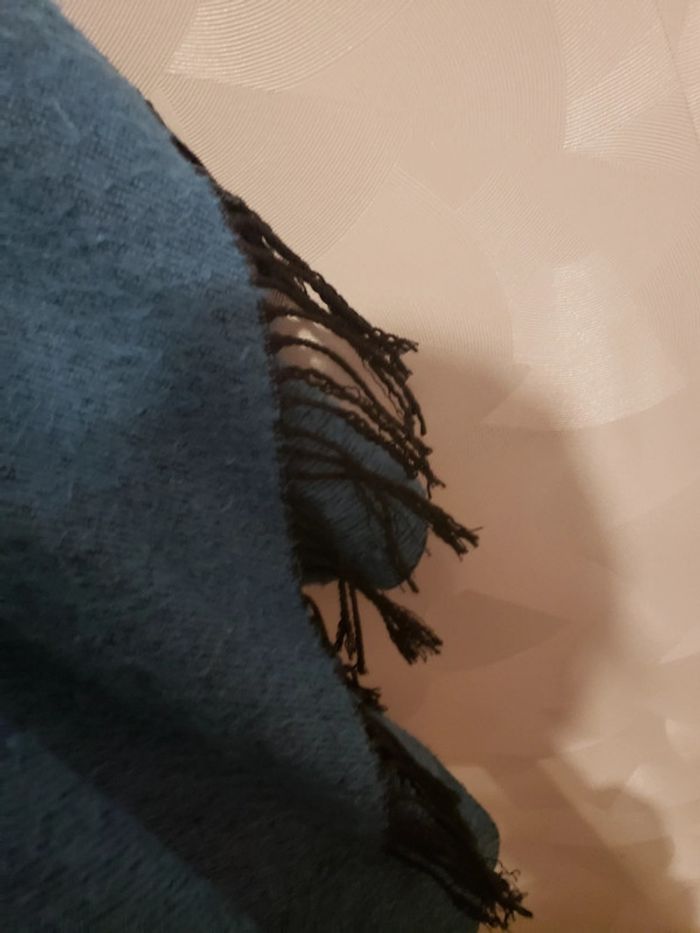 Echarpe/châle 🧣 en parfait état Couleurs : bleu canard et noir Réversible Franges Taille du mannequin : poitrine = 88cm, taille = 64cm, hanches = 83cm ⛔️ Pas de photo porté ⛔️ D’autres écharpes : #clemencecavalieriecharpefoulard