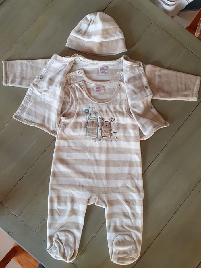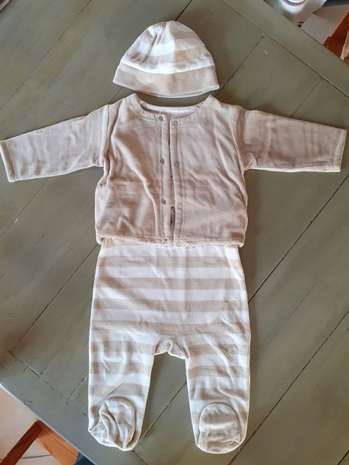Un ensemble comportant un pyjama hiver, une veste et un bonnet assortis. Aspect velours. Taille 9 mois. Porté une saison, excellent état. Marque : L'Enfant Do