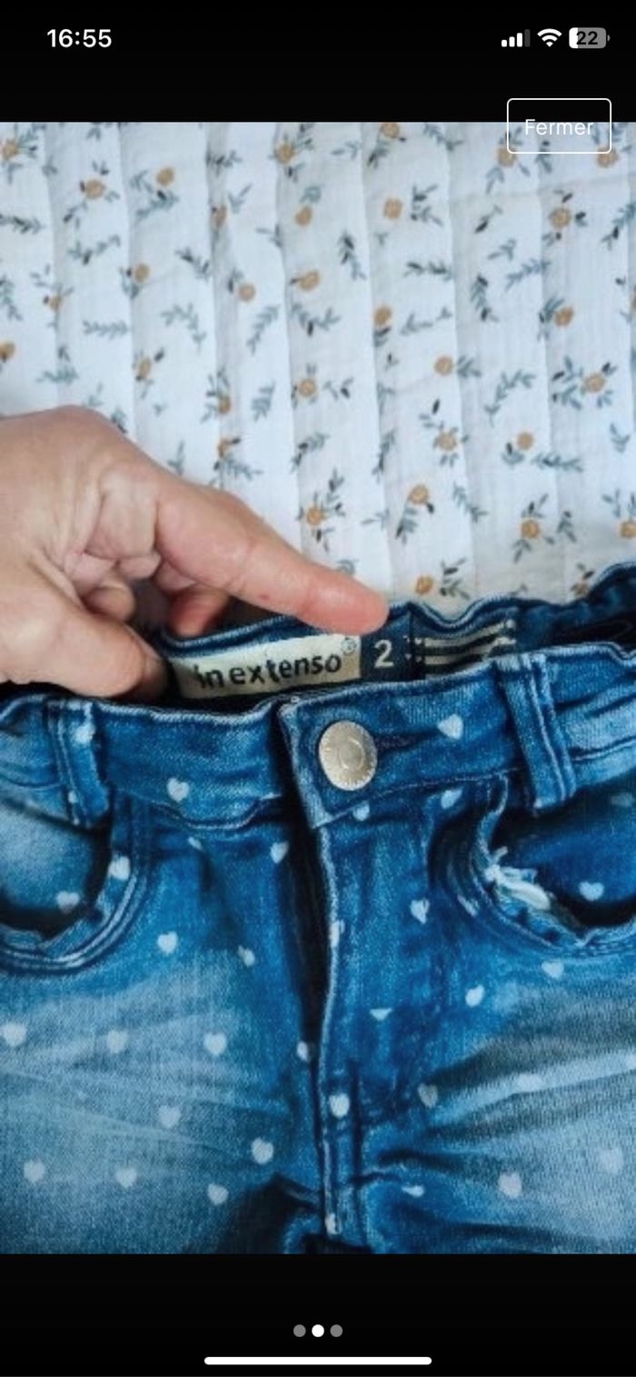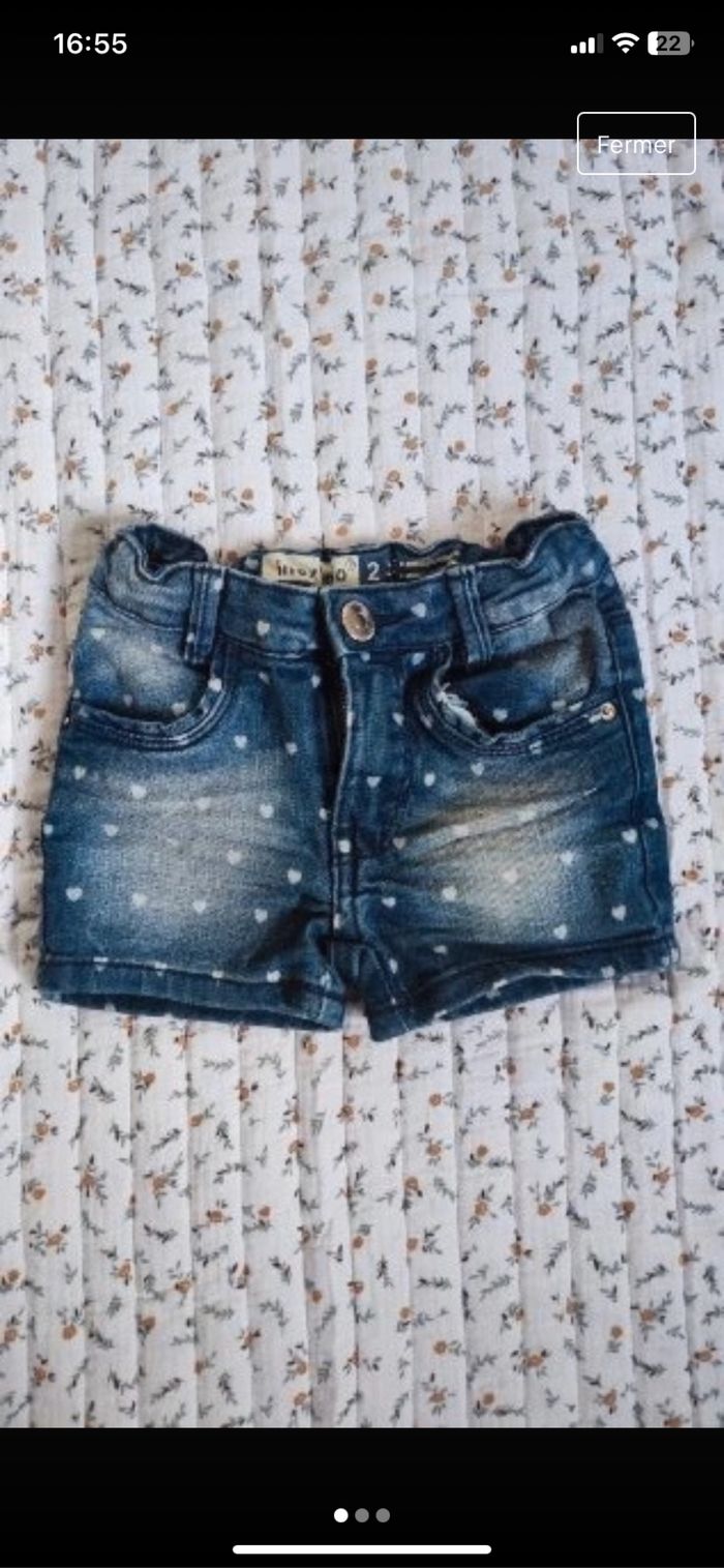 Lots de deux short Le mauve /fushia 3 ans sans réglage à la taille très bon état marque tissaia Le bleu avec des cœur blanc 2 ans réglable à la taille très bon état in extenso 1,50 euros les deux