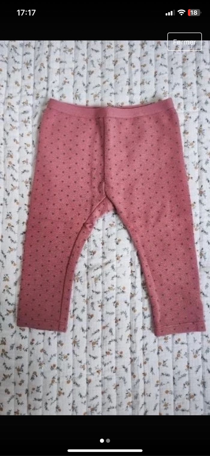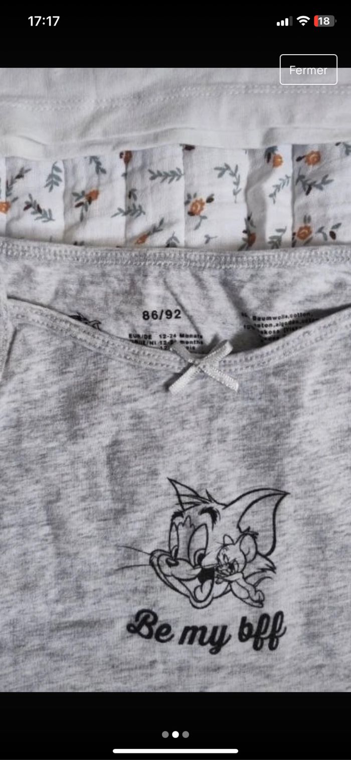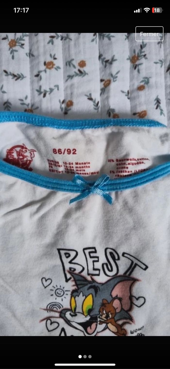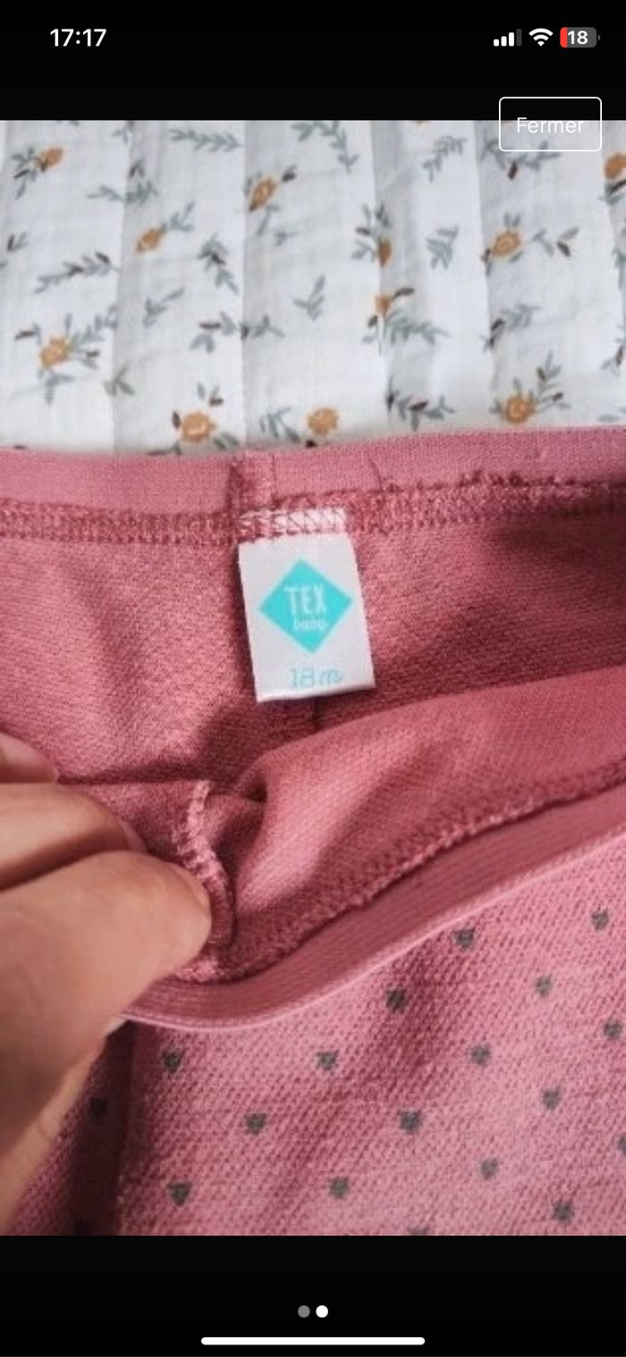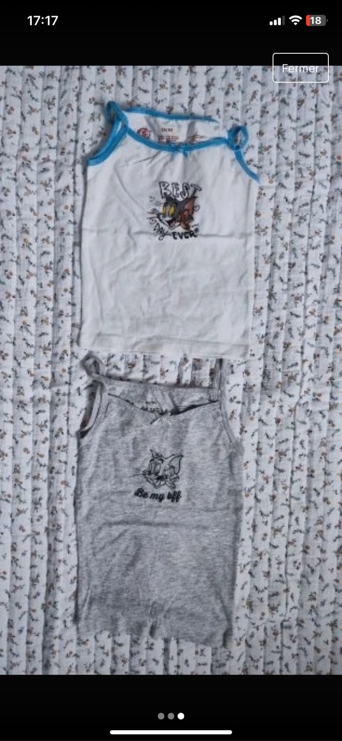 Deux tenues 18 mois Très bon état Deux débardeur marque Tom et Jerry Un pantalon jean dpa Un legging vieux rose à pois violet marque tex 2euros le tout