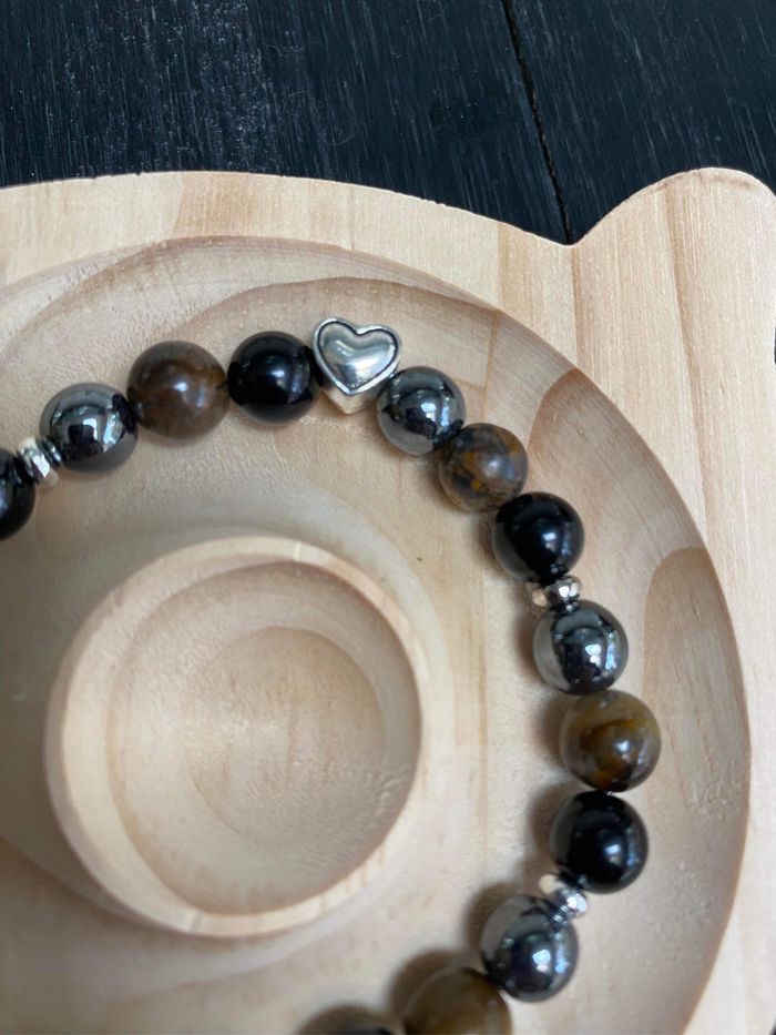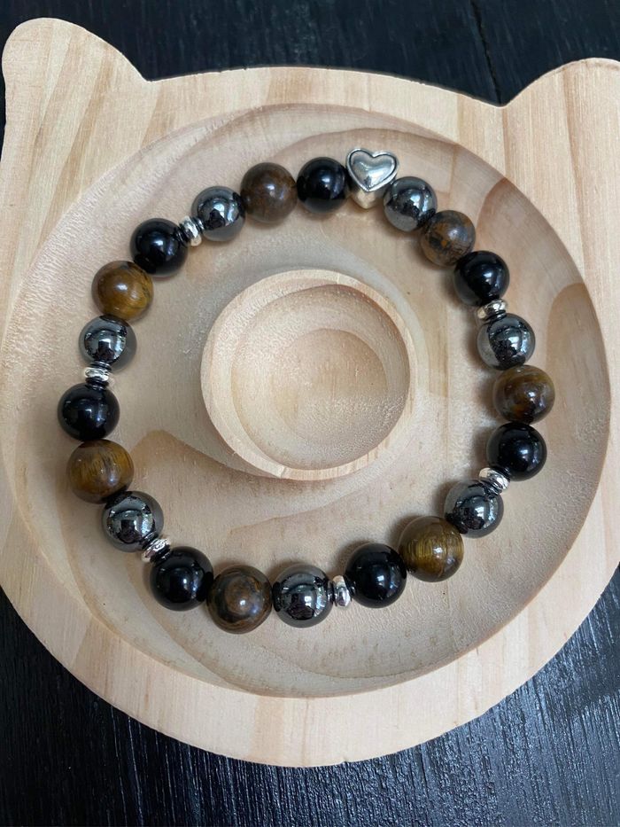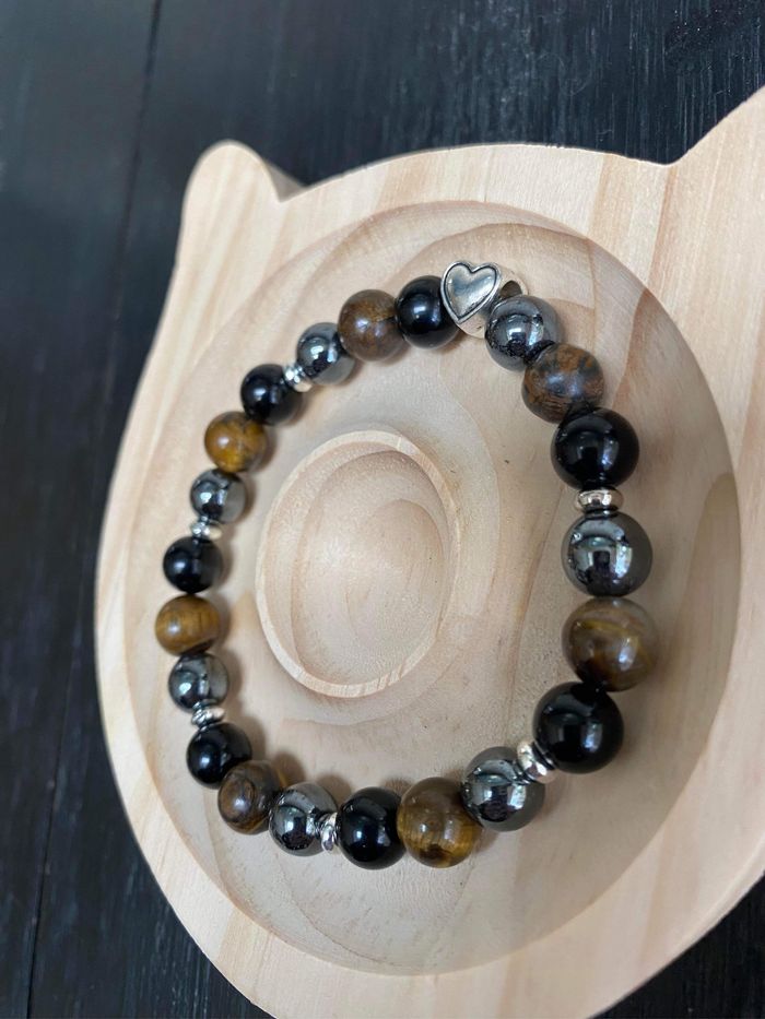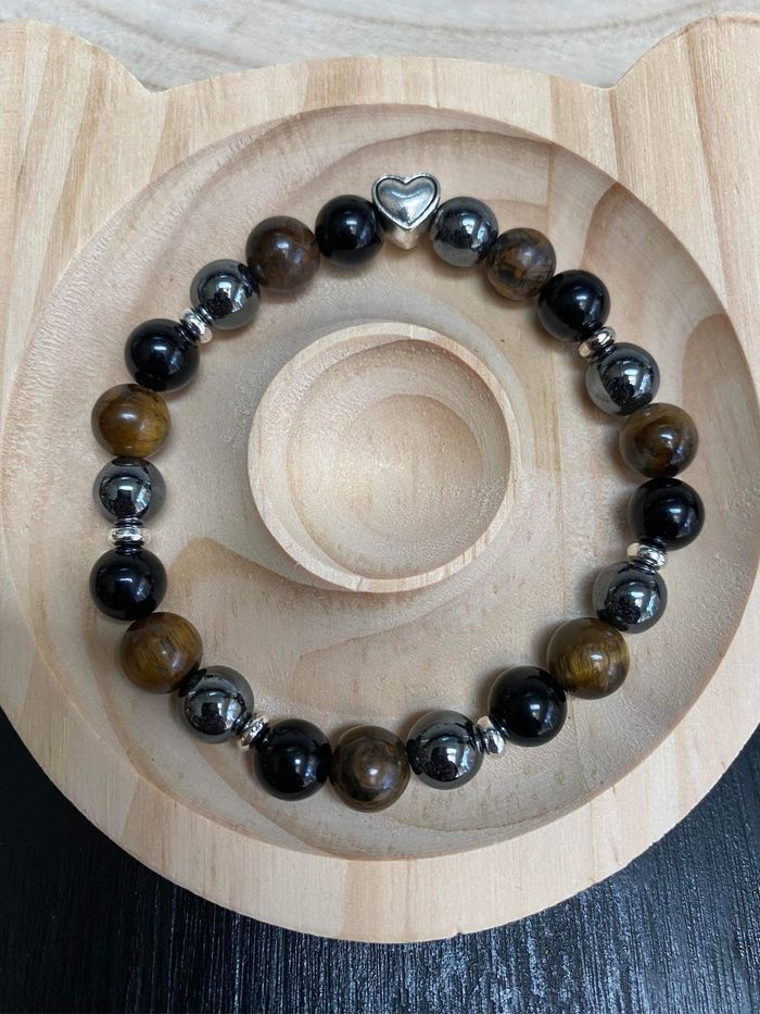 Très joli bracelet de lithothérapie en pierres d’œil de tigre , d’hématite et obsidienne et cœur de vie Taille 19 cm , perles de 8 mm ⚡️L’obsidienne noire ⚡️ - l’obsidienne noire est une puissante pierre de protection, - l'obsidienne noire est une pierre de répulsion, elle repousse toutes les énergies négatives surtout ceux qui cherchent à profiter de la personne - l'obsidienne noire nous fait ressortir notre moi profond, les bons comme les mauvais traits. cest pourquoi il est conseillé de ne pas porter l'obsidienne noire tout le temps. Il s'agit d'une pierre d'introspection. 🪨L’hématite 🪨 Pierre idéale pour le manque de confiance en soi. idéale pour retrouver l’équilibre. Elle peut vous donner du courage, de la volonté de la force et la joie de vivre, très utilisée contre la dépression réduit le stress et évacue les mauvaises pensées. L’Hématite peut également vous aider à optimiser votre capacité d’écoute et votre patience. favorise la confiance en soi et renforce la conviction. Elle aide donc à combattre la timidité et c’est un bon allié pour les personnes introverties. Il ne faut pas oublier ses effets positifs sur les individus colériques. Elle peut vous aider à utiliser vos énergies dans des actions plus positives. L’Hématite possède aussi le pouvoir d’éliminer les liens toxiques qui pourraient vous empêcher d’avancer dans la vie. Il faut citer, entre autres, les emprises psychiques et toutes sortes de relations toxiques. La pierre vous protègera des mauvaises ondes. Ainsi, même face aux divers obstacles, vous serez capable de trouver votre chemin et vous pourrez aussi les surmonter facilement. Œil de tigre Grâce aux vertus de la pierre qui le compose, le bracelet œil de tigre constitue un véritable barrage contre les énergies négatives et les malédictions. Il agit même comme un miroir et renvoie ces ondes négatives vers l'objet ou la personne qui les a émises. 25