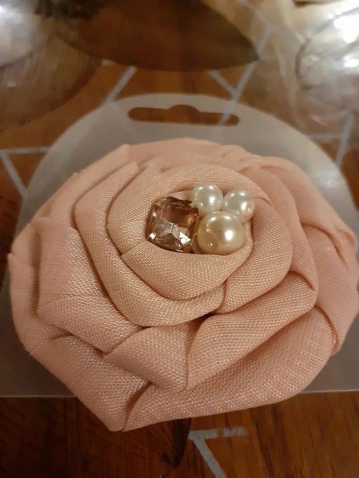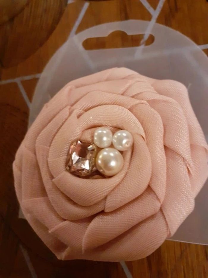 Pince à chignon femme Avec fleur Attaches pince ou épingle Matières tissus, strass, perle (imitation)et métal Couleurs rose, blanc et argenté En très bon état