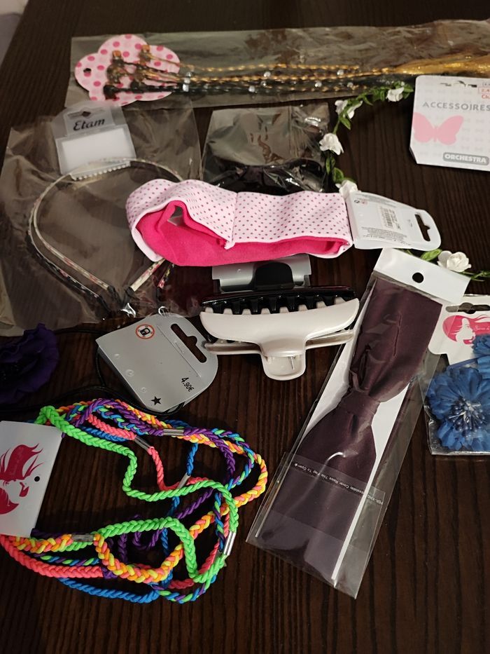Lot d'accessoires cheveux fille Plus de 10 articles Élastique serre tête pinces Il y en a a l'unité et en lot Le tout coloré pour les petites filles Il y en a sans marque Serre-tête Etam et orchestra