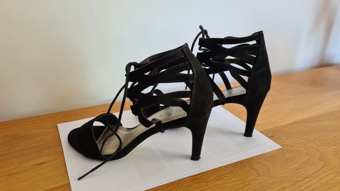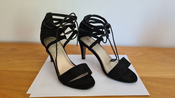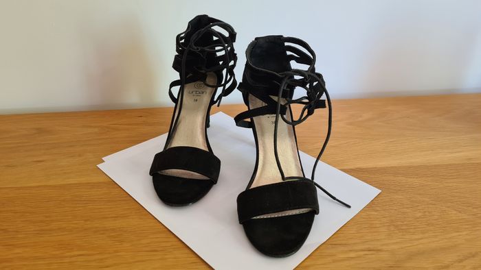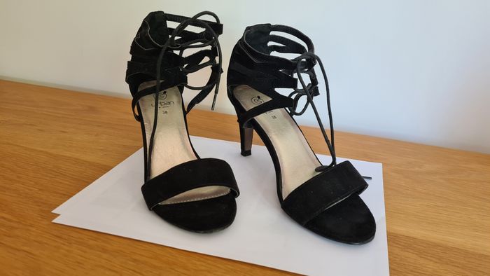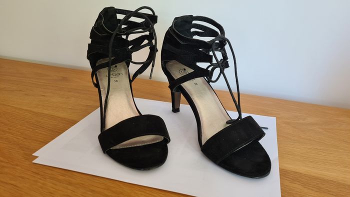 Très jolies sandales en daim noir, taille 38, peu portées, avec fermeture lien à la cheville, talons 8 cm, marque Urban.
