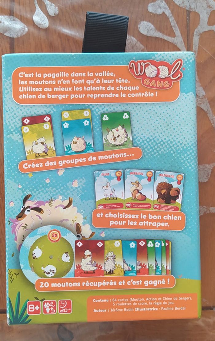 Jeu de société sous emballage - Prix Ferme Français à partir de 8 ans moins de 30mn 2 à 5 joueur(s) Montrez aux moutons facétieux qui est la patron ! Dans Wool Gang, c'est la pagaille dans la vallée, les moutons n'en font qu'à leur tête. Utilisez au mieux les talents de chaque chien de berger pour reprendre le contrôle ! Une fois toutes les cartes moutons jouées, choisissez quels chiens de berger vous voulez envoyer pour les récupérer. Attrapez 20 moutons et c'est gagné! A vous de ruser et de sortir les crocs ! Contenu : 14 cartes Chien de Berger 28 cartes Mouton 2 cartes Joker 10 cartes Action 10 cartes Niche vide 5 Roulettes de score 1 règle du jeu Ludipresta