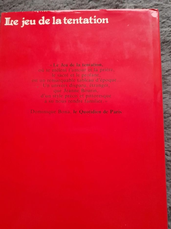 Lot de 2 livres de Jeanne Bourin La chambre des Dames Le jeu de la Tentation Livres de France Loisirs Dépôt Légal en février 1984 Le jeu de la Tentation : «Le jeu de la tentation, où se mêlent l'amour et la prière, le sacré et le profane, est un remarquable tableau d'époque... Un univers disparu, étranger, que Jeanne bourin d'un style précis et pittoresque a su nous rendre familier.» Dominique Bona, le quotidien de Paris La chambre des Dames: «Ce livre est historiquement vrai... Il est aussi passionnant et émouvant à lire. C'est beau, grave et doux comme la dame à la licorne... Je vous défie de commencer la chambre des dames sans aller jusqu'au bout...» Françoise Xenakis, le Matin.