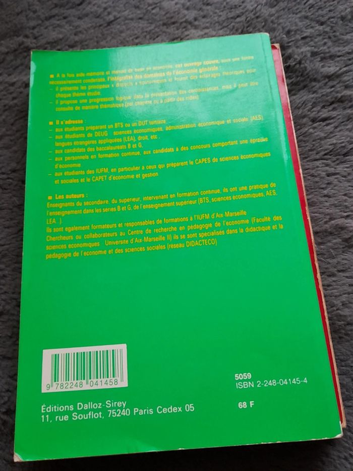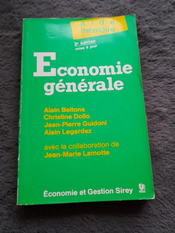 Livre L'économie d'entreprise de Gilles Bressy et de Christian Konkuyt Économie et gestion Sirey : aide mémoire Livre L'économie générale (3eme édition mise à jour) de Alain Beitone, Christine Dollo, Jean-Pierre Guidoni, Alain Legardez, avec la collaboration de Jean-Marie Lamotte Économie et Gestion Sirey: aide mémoire Ils datent de 1990 et 1992 mais contiennent certaines formules etc encore utilisée dans les cours de SES et/ou d'économie au lycée et à la fac Si ça peut aider certains étudiants :) Lot et réduction possible :)