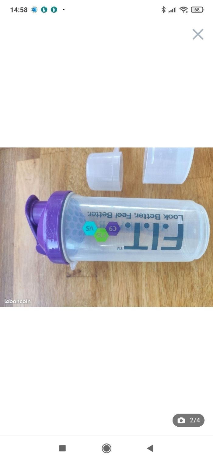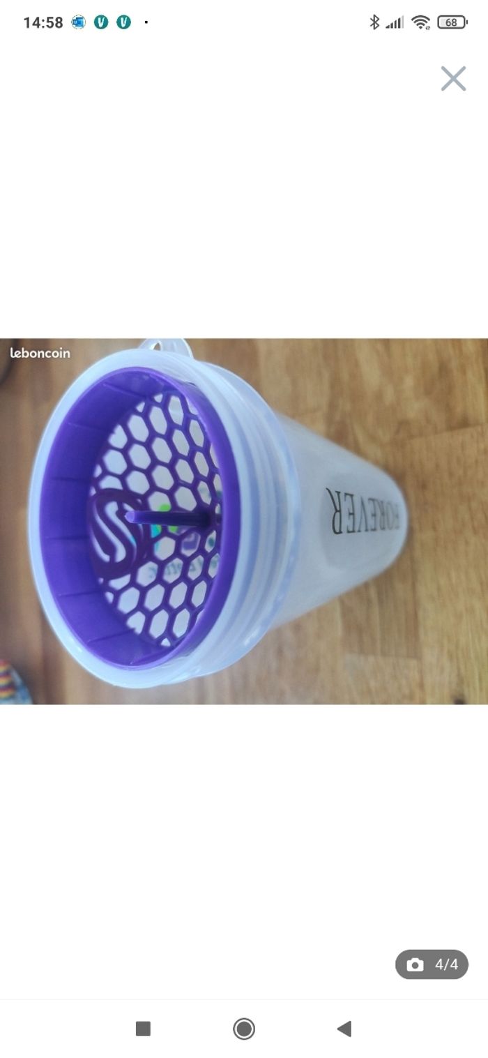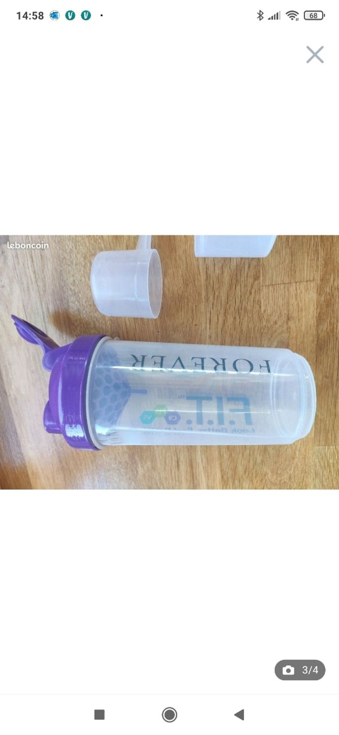 Shaker neuf car double emploi, un fond qui se visse pour mettre de la poudre à shaker, une cuillère doseuse et un tamis. Marque Forever. Petite encoche sur le côté pour le mettre autour d'un fil et le porter à la ceinture