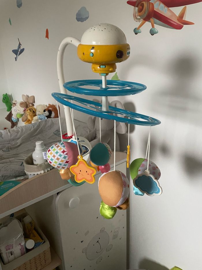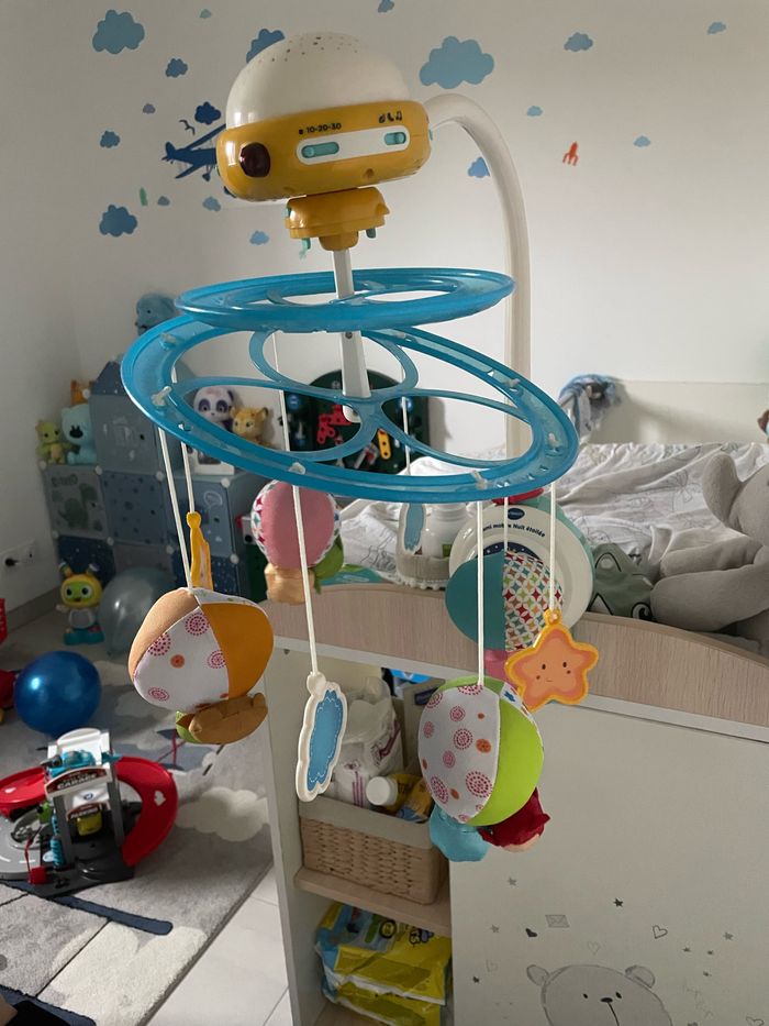 Berceuse qui tourne avec musique douce et projection étoile au plafond. Très pratique pour endormir 👶 Petite peluche montgolfière avec nuage. Marque vtech