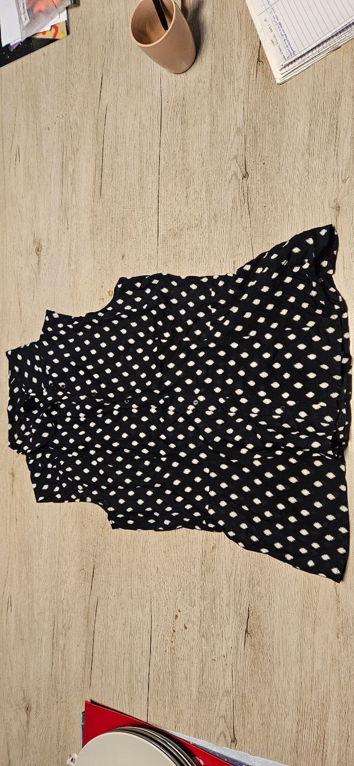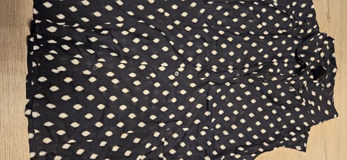 Blouse longue noire à motif blanc. Nickel car mise 1 heure mais trop juste pour moi. Se ferme par des boutons