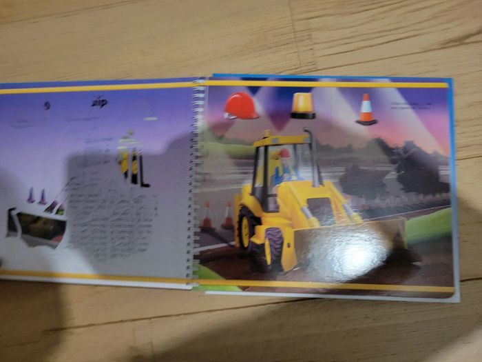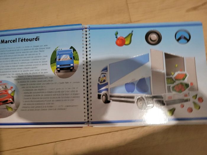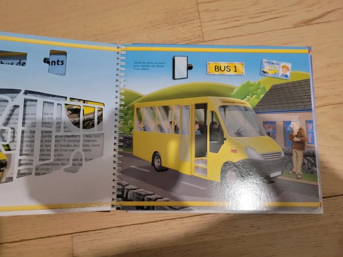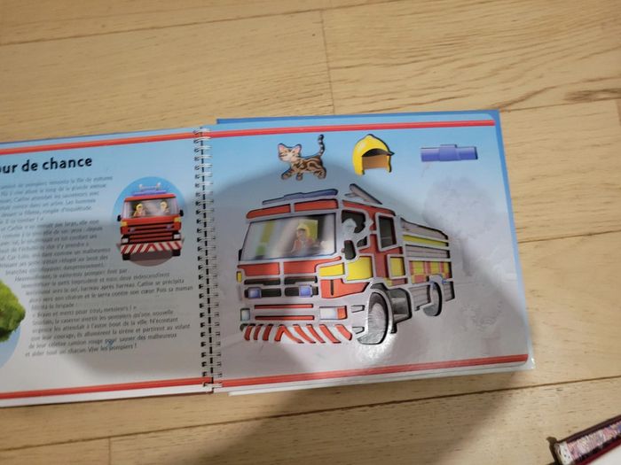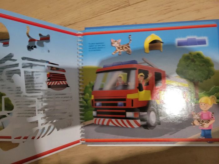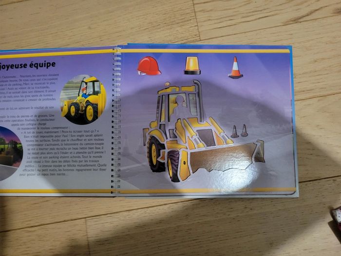 Livre avec histoire et pochoir intégré. Tracteur, camion pompier, bus...différents véhicules.