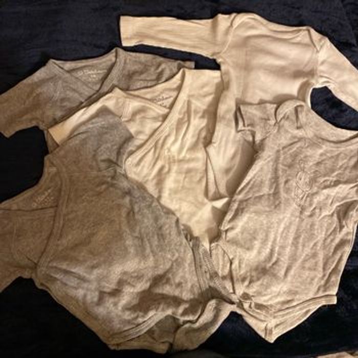 Lots de 5 bodies 6 mois Gris et blanc dont un manche longue et deux avec motif (voir photos) Les marques sont 3 kitchoun, 1 kimbaloo et 1 boîte à malice Aucune taches