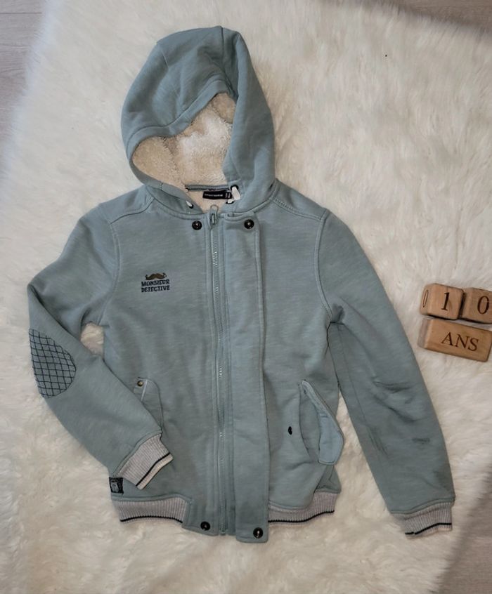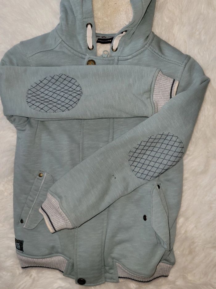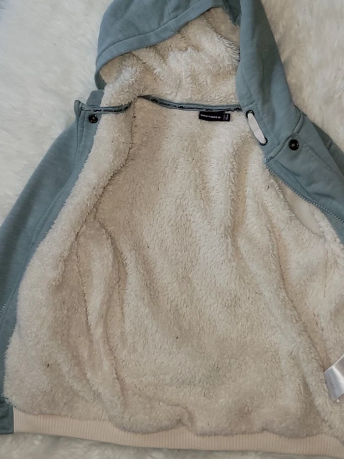 Veste en Jersey doublé en moumoute. Idéal en mi saison. Le dos des manches a une tache de crayon.