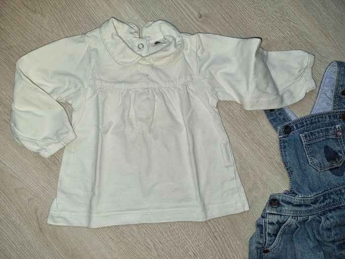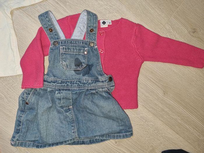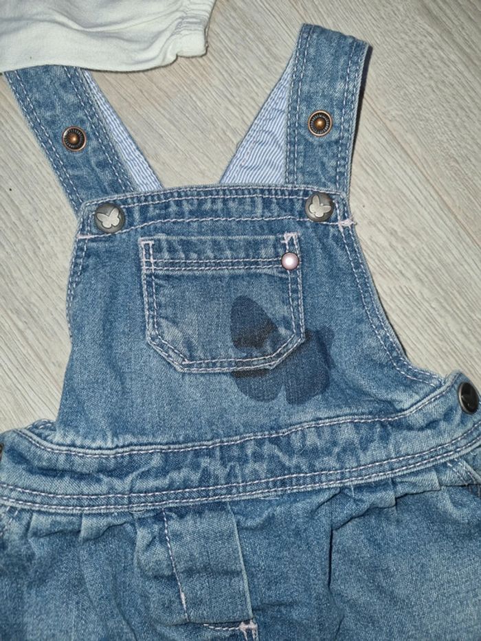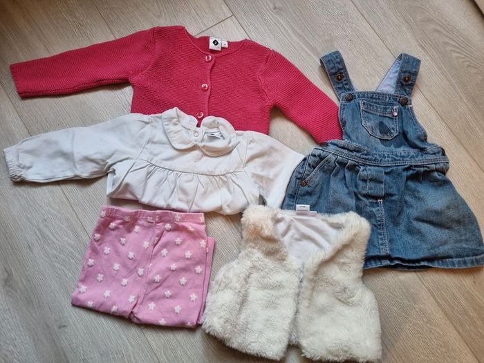 Lot comprenant une robe en jean papillon 6mois, Un tee shirt blanc col Claudine 3mois taille grand , Un leggin 3mois, Un gilet 6mois Un gilet sans manches tout doux 3mois.