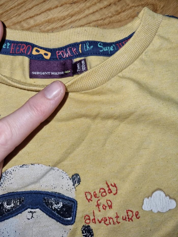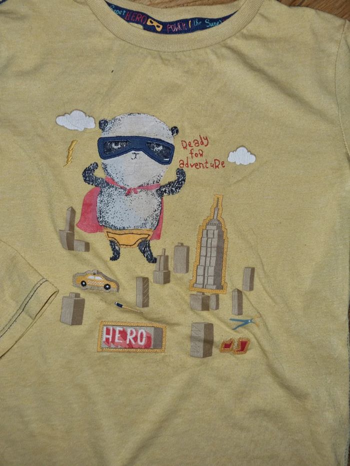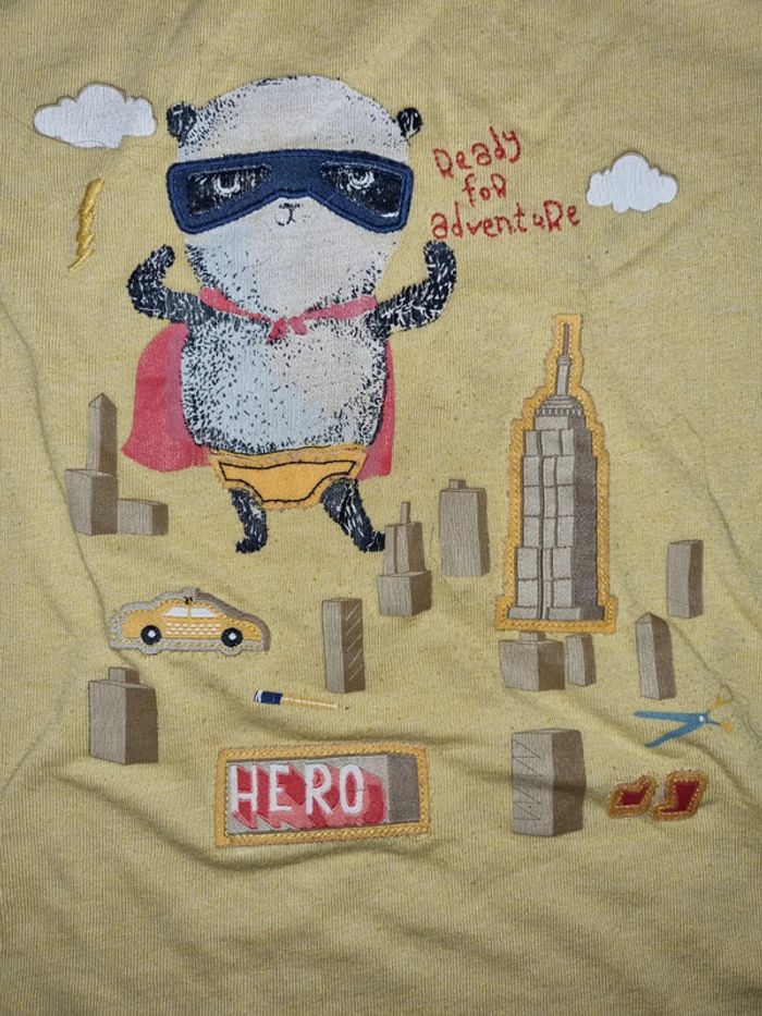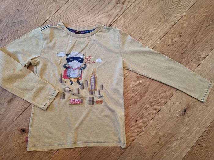 Tee shirt manches longues imprimé super héros. Bien porté, le jaune est moutarde