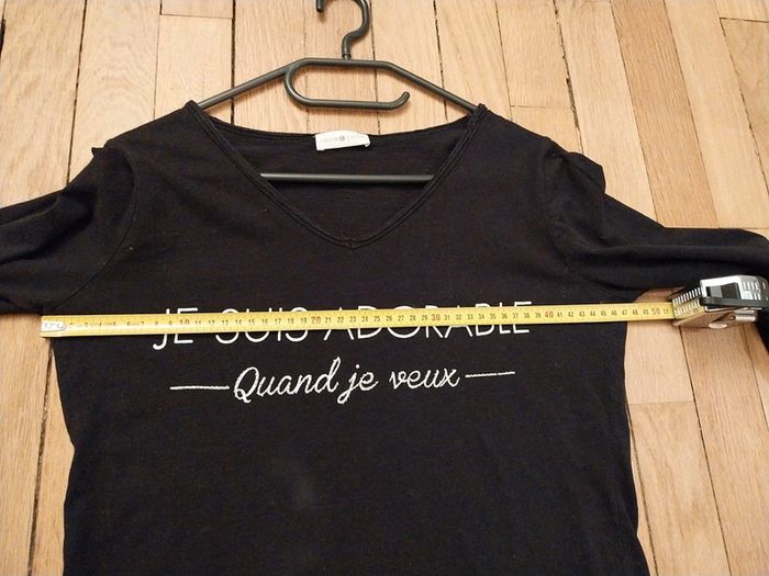 T-shirt noir, manches longues, "je suis adorable quand je veux" de la marque Cache-cache. Strass présent sur la phrase "quand je veux". Taille effacée mais correspond a un L, voir les mesures sur les photos. Porté mais encore en très bon état. #mariesouc_l #mariesouc_noir #mariesouc_haut #mariesouc_cachecache