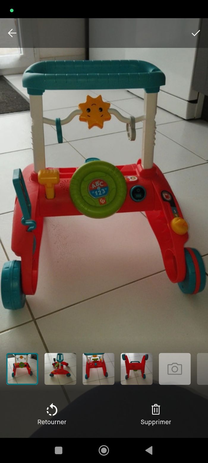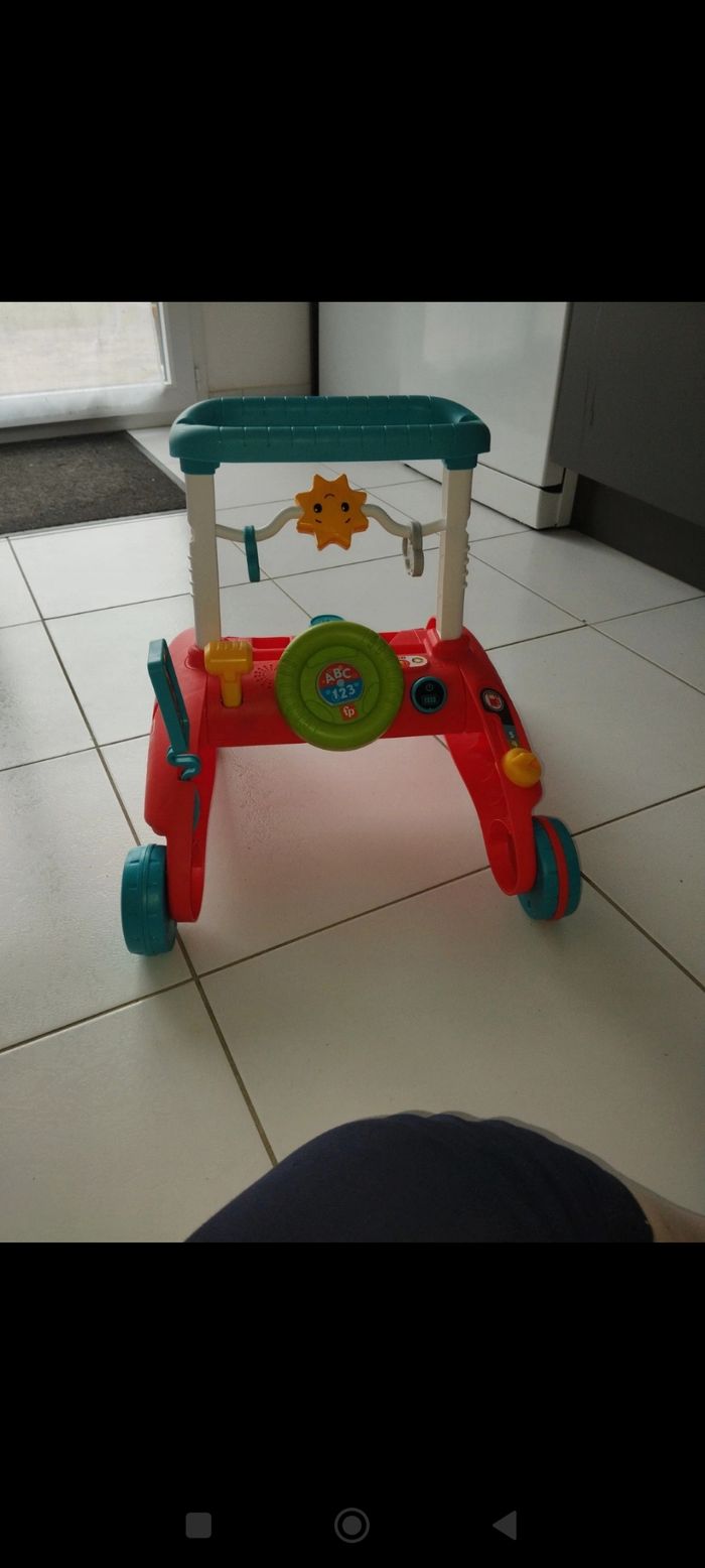 s'amusant.manque juste un petit élément carré mais rien d'important au fonctionnement du trotteur.prix ferme Trotteur pour bébé avec 2 côtés d’activités et 3 modes de jeu à mesure que bébé passe du jeu assis au jeu debout, puis qu’il commence à marcher Permet de marcher dans deux directions ! Les roues Rythme Stable et Régulier ralentissent le rythme pour apprendre à marcher 3 niveaux d’apprentissage Éveil Progressif avec plus de 100 chansons, sons et phrases pour apprendre l’alphabet, les chiffres et les contraires Plus de 10 activités, y compris un tableau de bord factice avec volant, un klaxon lumineux, des boutons ABC/123, 3 formes à trier et bien plus encore Améliore la motricité fine et globale et favorise l’apprentissage par le jeu pour enfants de 6 mois à 3 ans