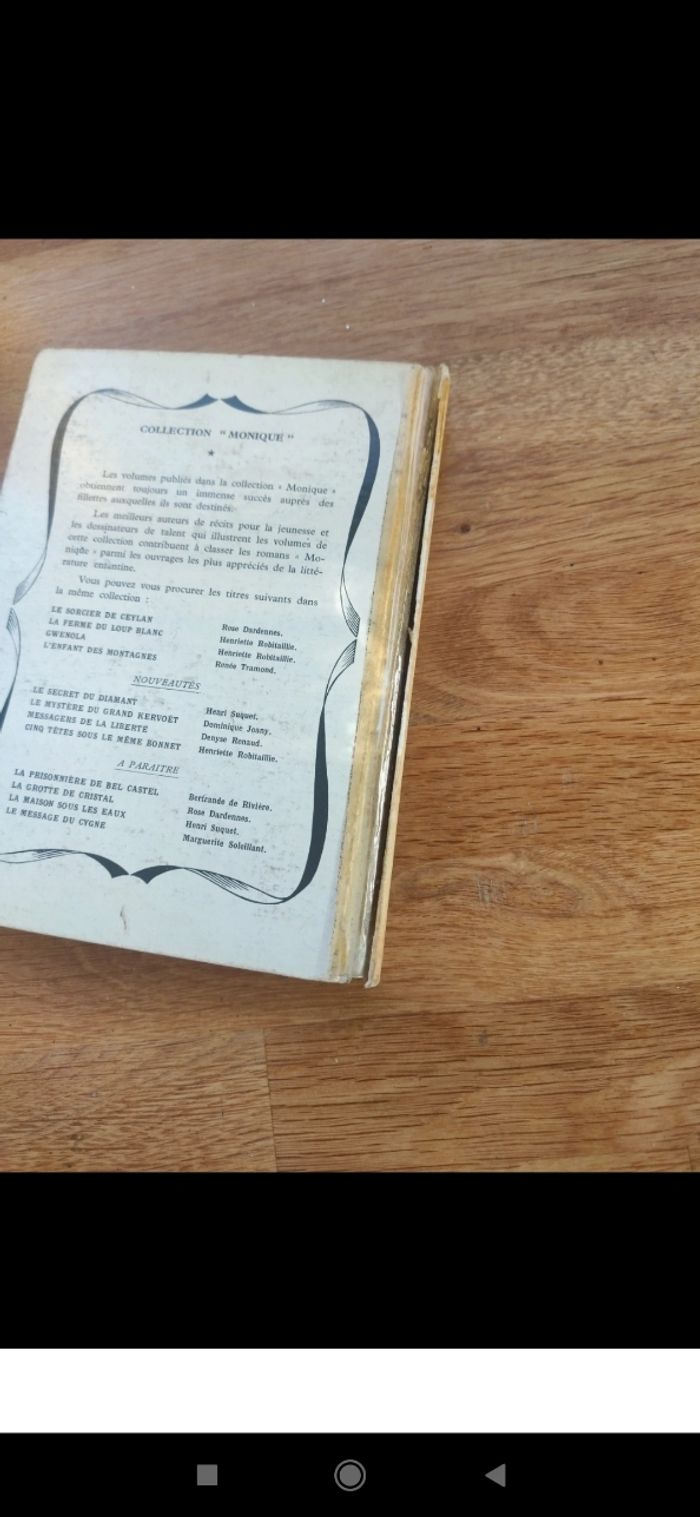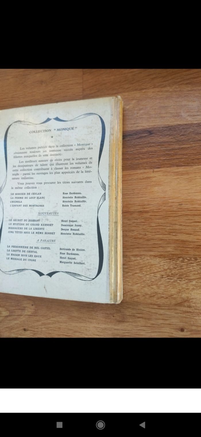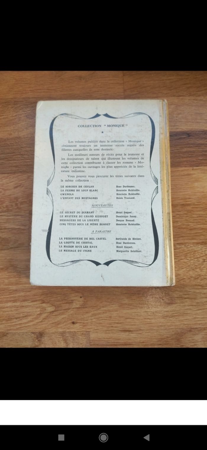 Un livre pour enfants de Denise Renaud de 1954 aux éditions Fleurus dans la collection Monique. La reliure du livre a été un peu rafistolée et pour autant la tranche s'est redécollée, les pages sont bien jaunies et il y a un endroit aussi qui menace de céder à l'intérieur. Bref en état de son âge !