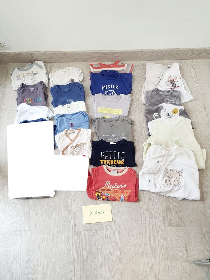 Lot garçon 3 mois Ou à l'unité : composez votre lot. 😊 1€ pièce 8 body 6 T-shirts manches courte et longues 3 grenouillère 1 haut de pyjama N'hésitez pas à faire un lot le prix est dégressif 😉