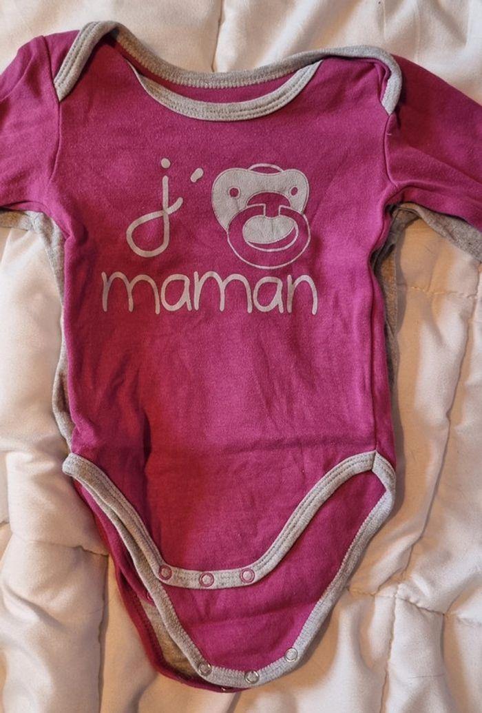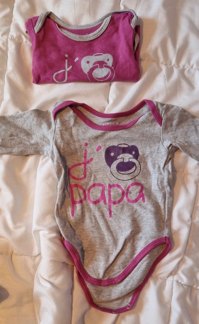 2 bodies 6mois. J'aime maman et j'aime papa. Comme neuf car noté 9 mois mais taille en 6 mois donc porté 1 fois car trop petit. Kimbaloo
