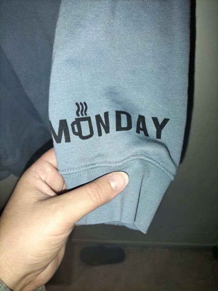 Sweat à capuche, bleu gris, coupe droite. Inscription en noir en bas de la manche gauche. Très bon état.