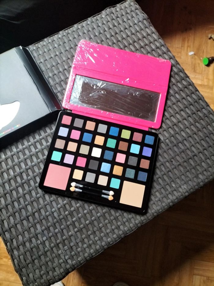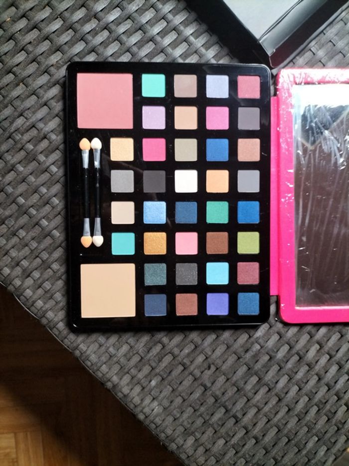Grande palette de fards à paupières et blush, avec pinceaux et miroir. Neuf