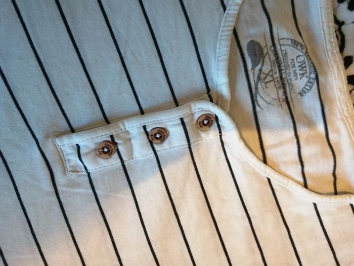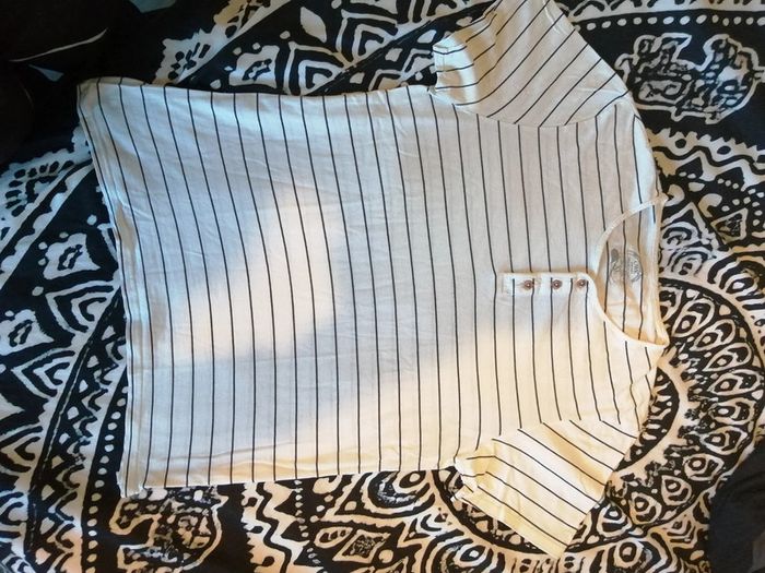 T-shirt blanc à rayures noires. Col rond avec 3 boutons. Taille Xl