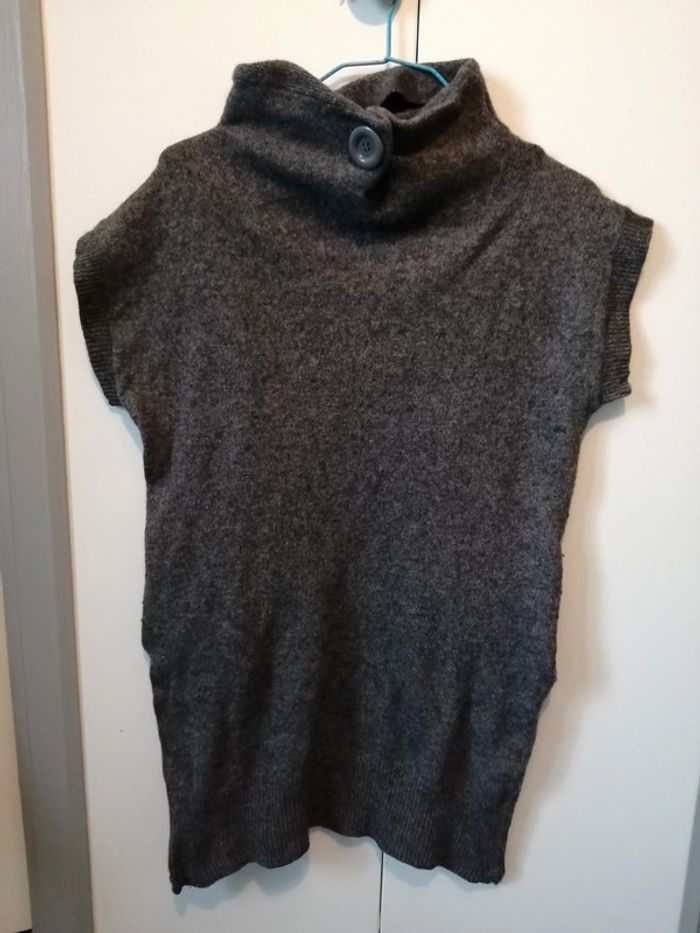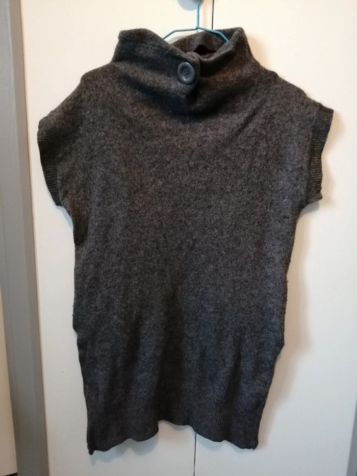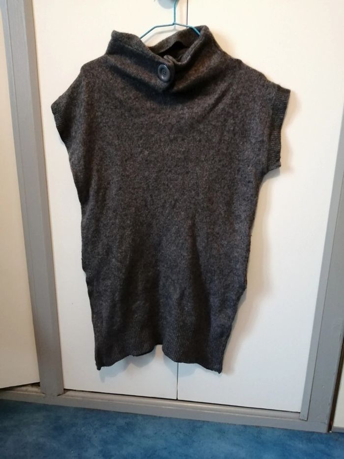 Pull tunique gris foncé à manches courtes. 2 poches latérales. Col montant avec un gros bouton. Taille 38/40. Bon état.