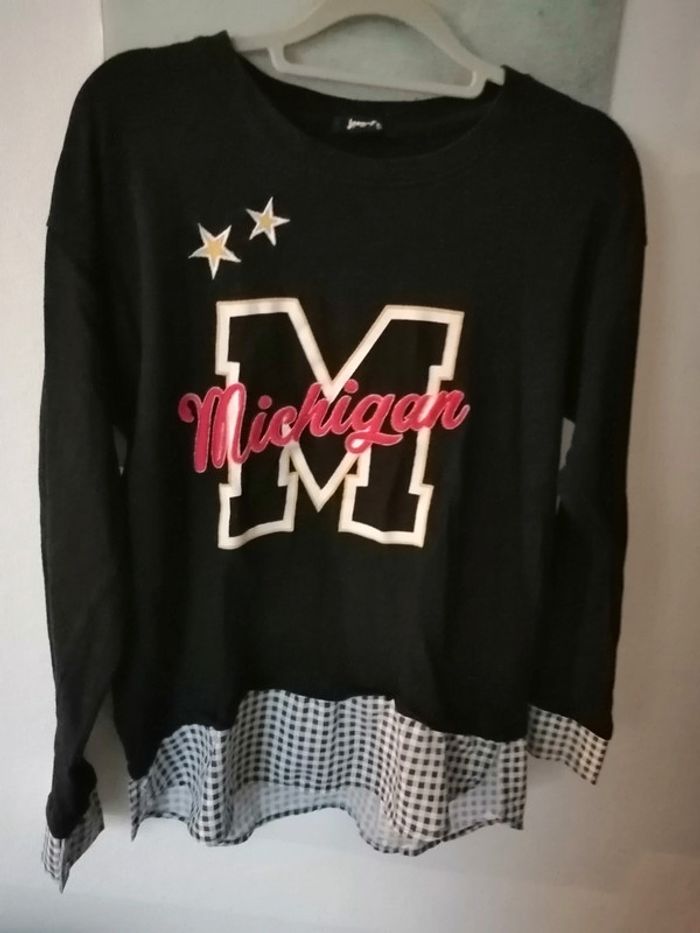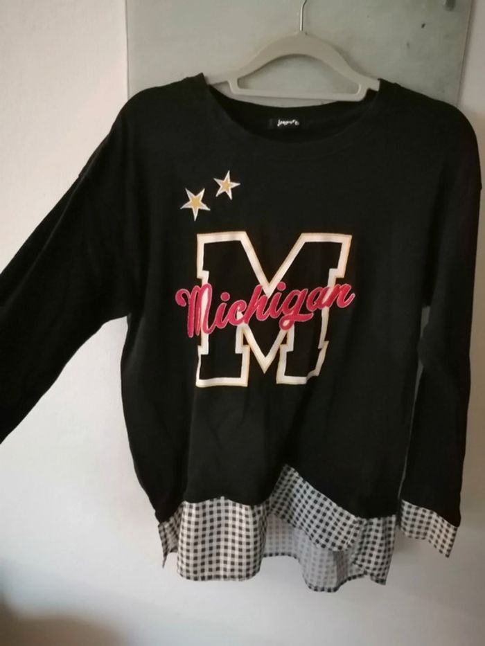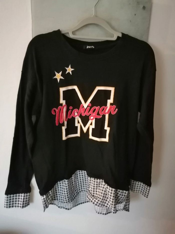 T-shirt manches longues noir+inscription. Bas et poignets façon chemise à carreaux noir et blanc. Taille M. Très bon état.