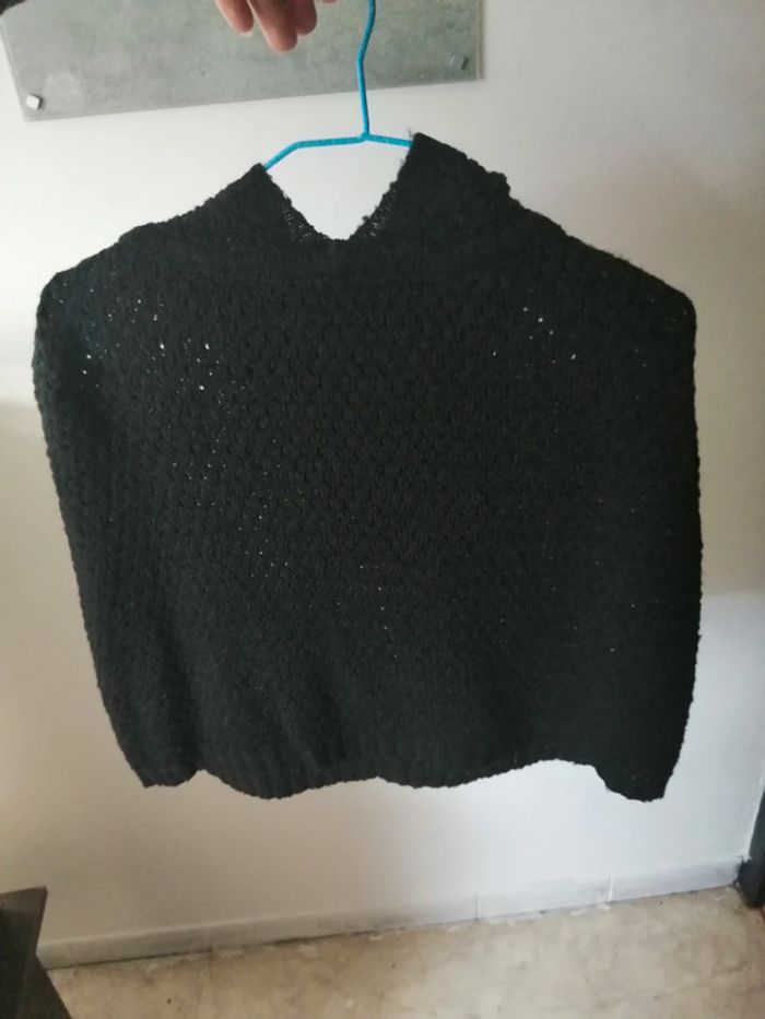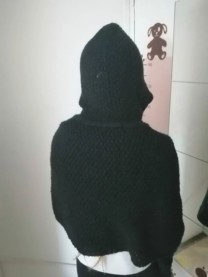 Poncho en mailles de laine, noir, à capuche, bas droit. Taille unique enfant. Assez bon état.