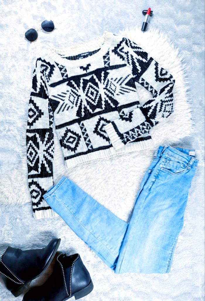 Joli pull blanc à motifs géométriques noirs 🖤 Assez court 😘 C'est une taille XS ou taille 34 👌 En très bon état général 👍
