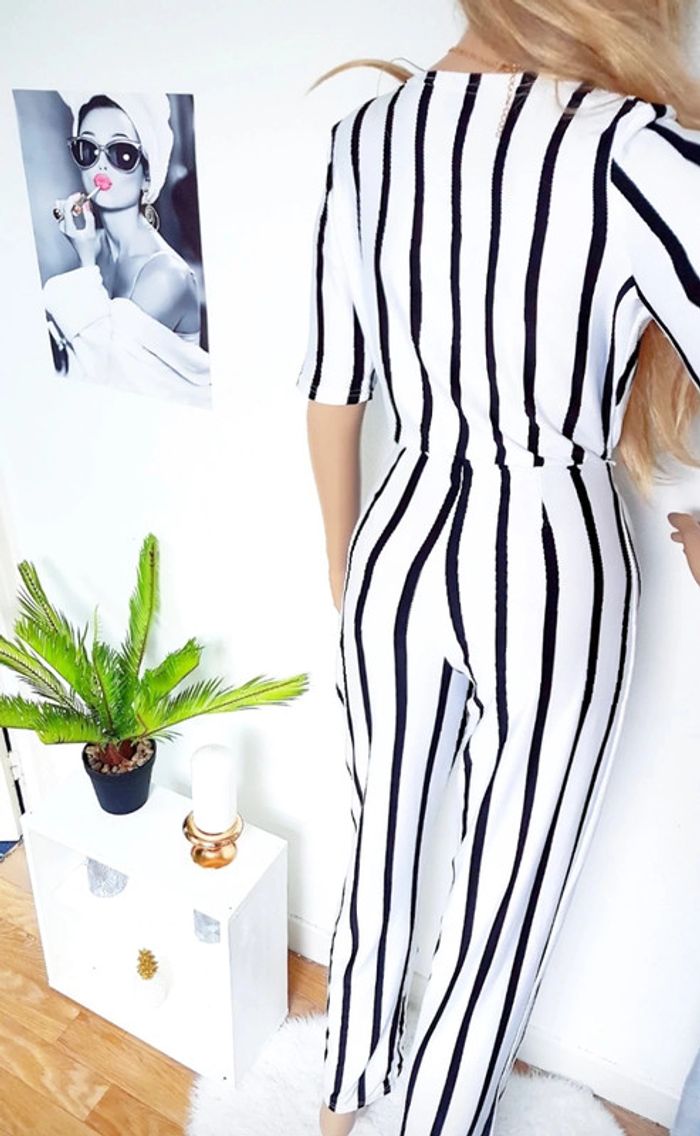 Combinaison longue rayée blanche et noire avec decolleté en V 🖤 C'est une taille S ou taille 36 😘 Le tissu est bien extensible donc peut convenir aussi à un S/M 😊 En état impeccable 👍