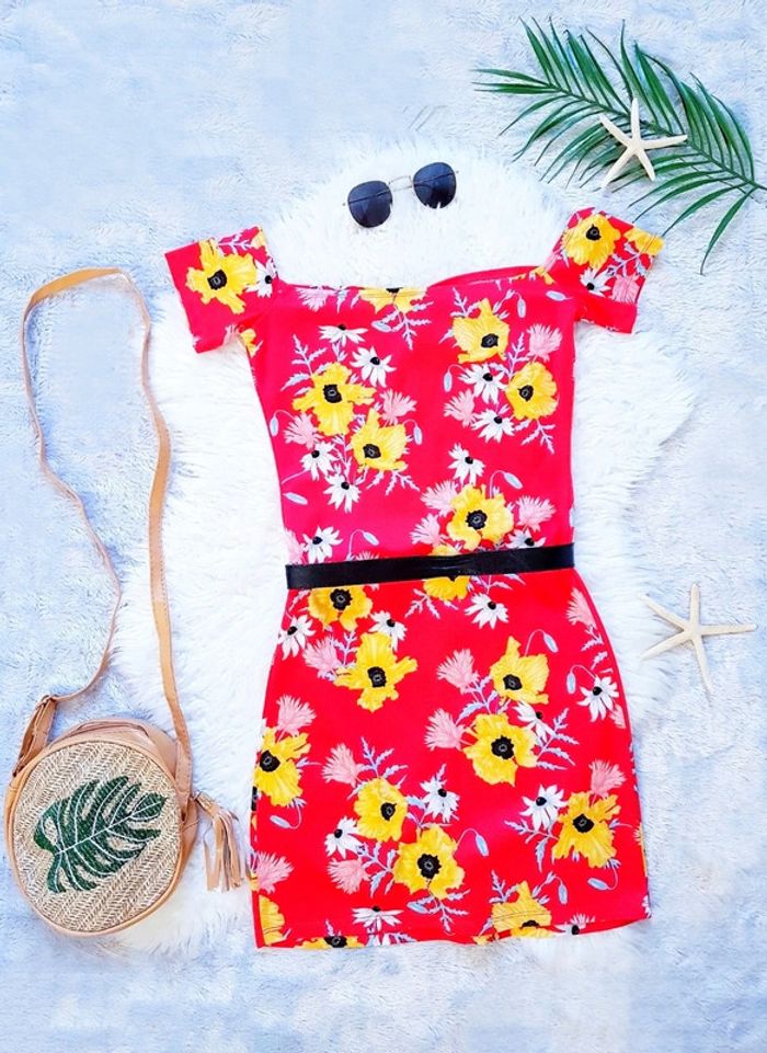 Jolie robe rouge à motifs fleuris et épaules dénudées 🖤 C'est une taille S ou taille 36 😘 S'adapte bien au morphologie car assez souple 👌 État comme neuf 👍
