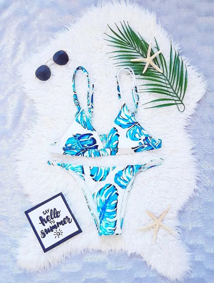 Joli bikini triangle blanc et turquoise à motifs palmiers 🖤 Taille S ou taille 36 😘 État neuf! 👍 Rembouré.
