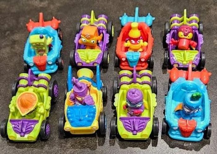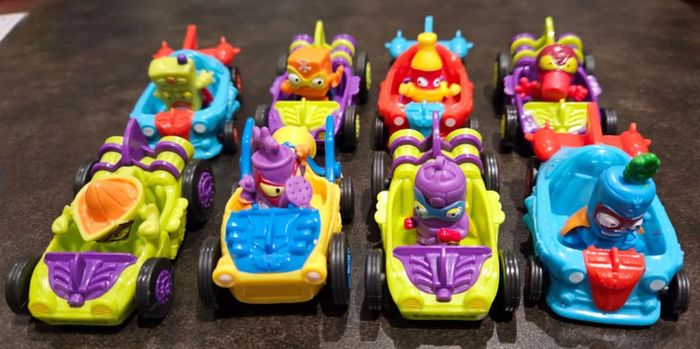 Lot de 8 voitures et de 8 figurines Superzings de marque Goliath en très bon état Ref JO6