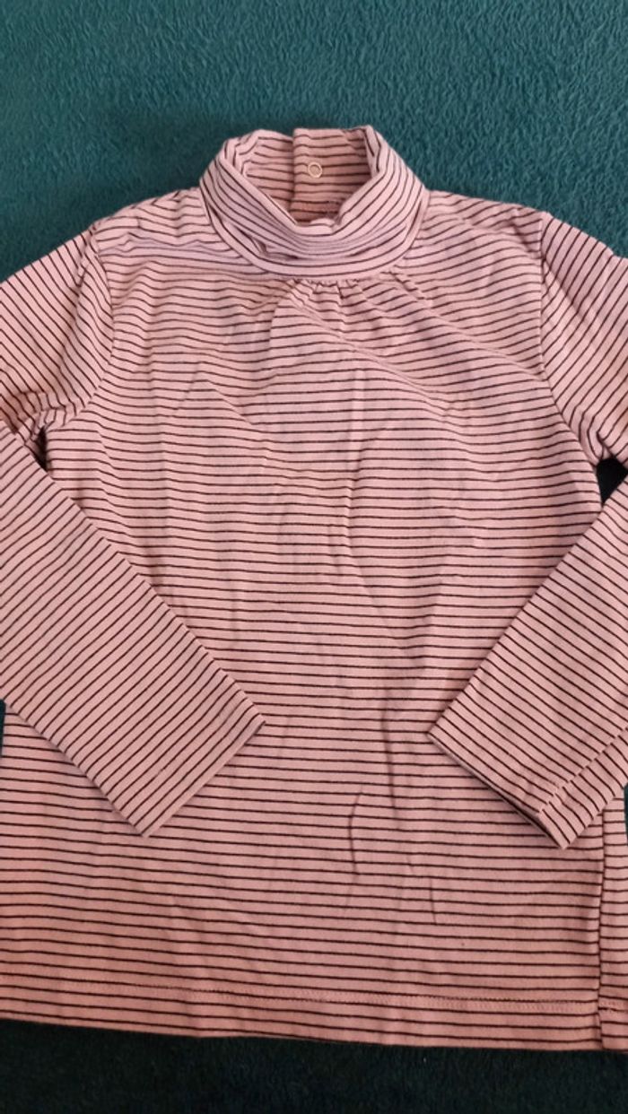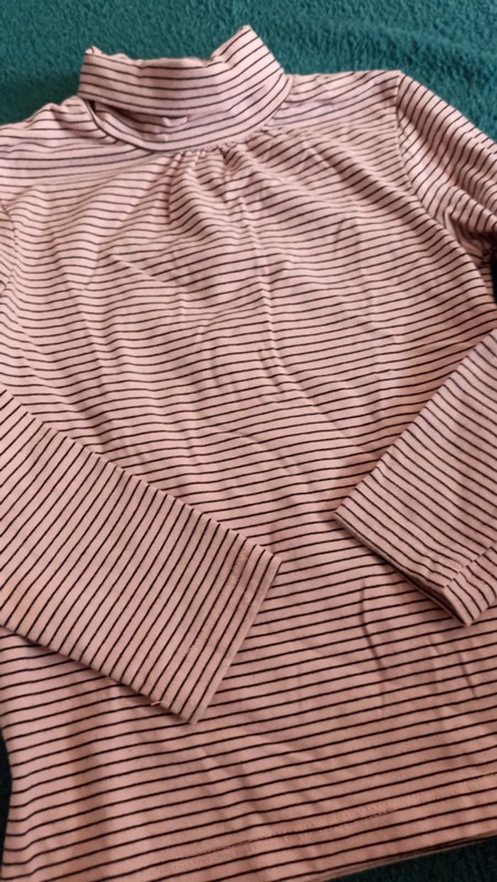 T-shirt manches longues roses à fines rayures noires. Col roulé.