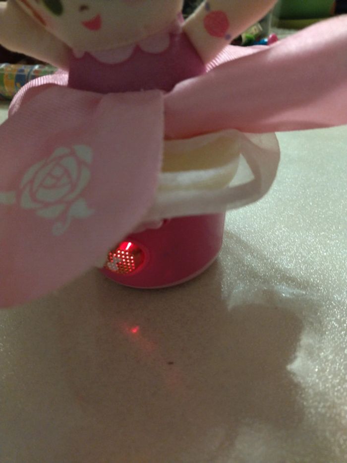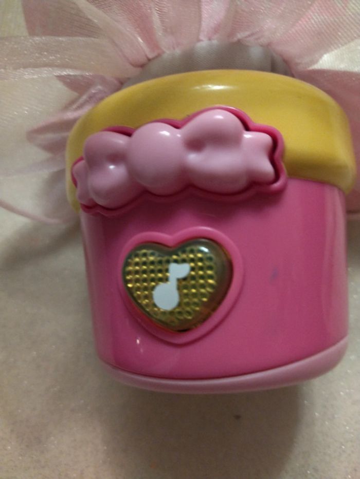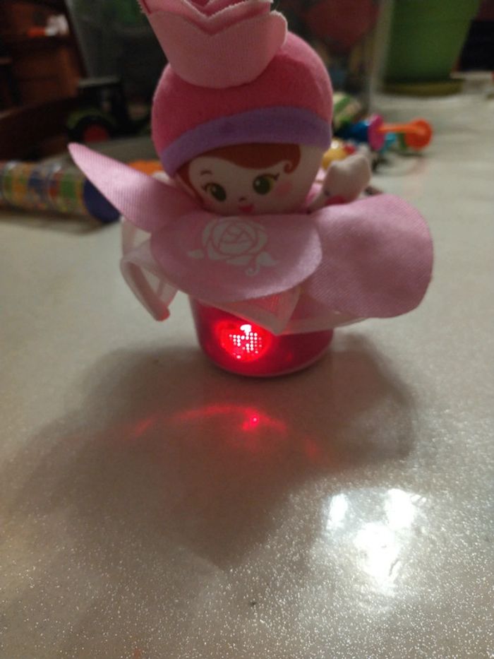 Culbutos poupée musical et lumineux.. enfoncez la poupée et la faire remonter en appuyant sur le nœud rose. 6/9 mois. Très bon état.