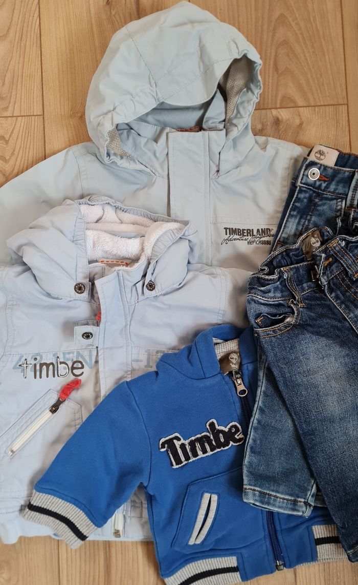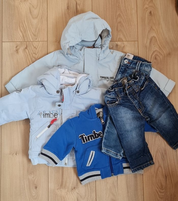 Lot vêtements Timberland (Un manteau, un parka, 2 jeans et une veste) Taille 6 mois Dans le lot un jeans Taille 9 mois