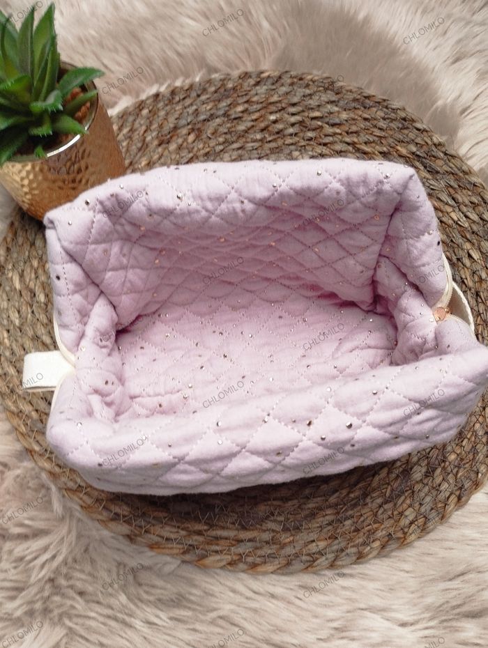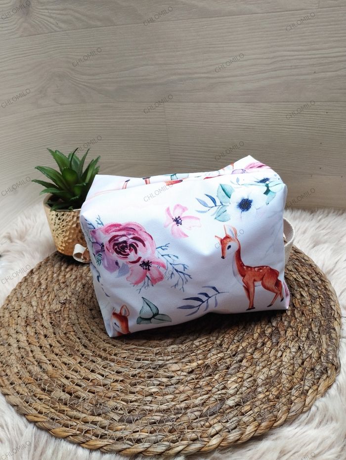 Trousse de toilette: Dimensions idéales pour mettre les couches et le nécessaire de toilette de bébé Vous pouvez aussi l'utiliser en trousse à maquillage ou trousse de voyage. L'intérieur est en double gaze de coton molletonné, l'extérieur est en coton enduit imperméable. Dimensions L19xH12xP10 Différents coloris possibles Possible également de floquer un prénom sur la trousse (+2€)
