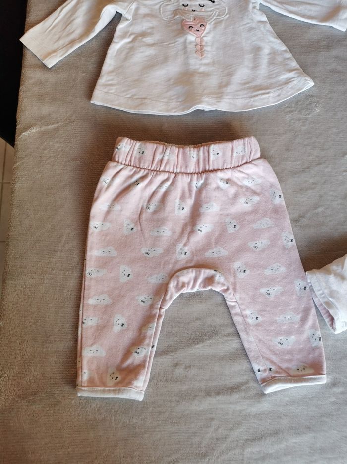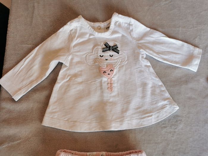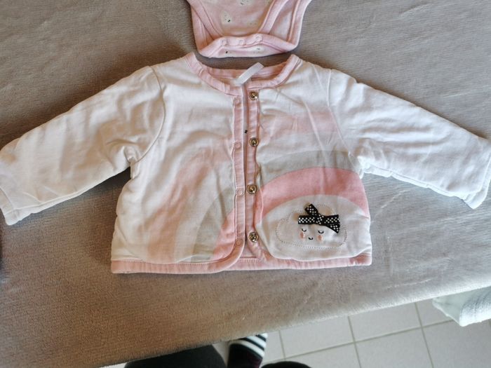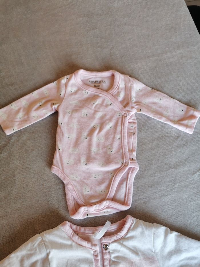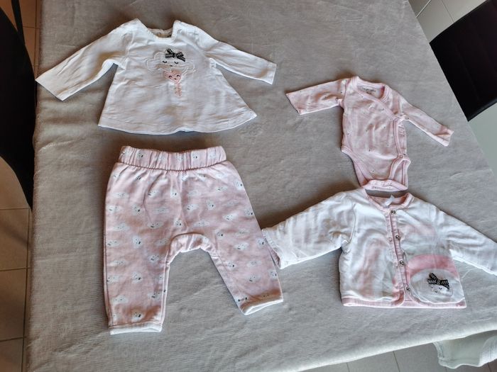 Ensemble 4 pièces Orchestra Le body et le tee shirt sont en naissance et la veste et pantalon en 1mois mais il n'y a pas vraiment de difference En parfait état, collection actuelle