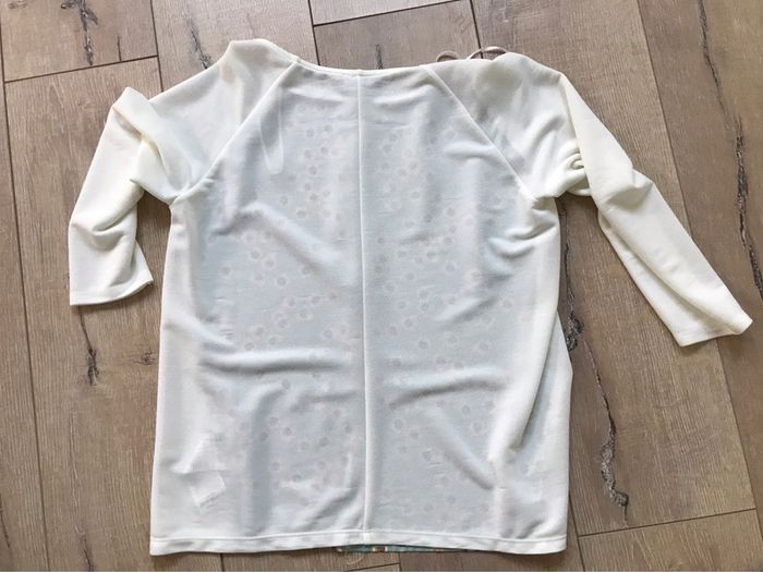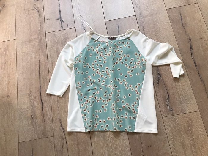 haut Grain De malice devant turquoise à motifs au dos blanc cassé uni modèle très frais pouvant se portant avec un jean ou une jupe jamais porté acheté sur un coup de tête