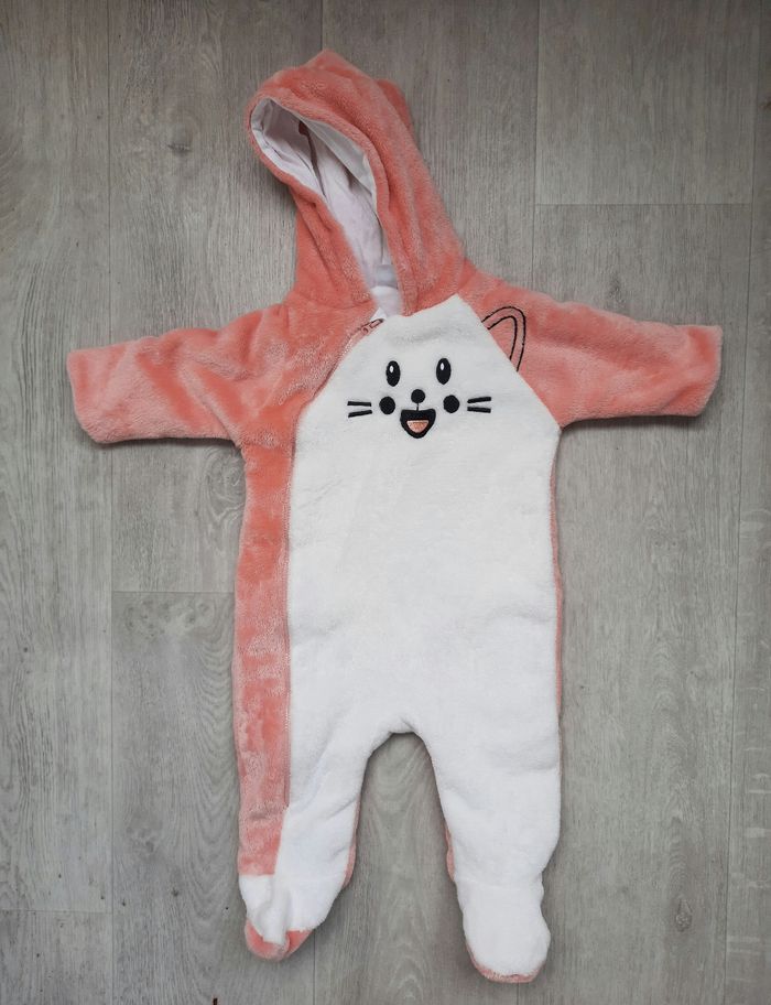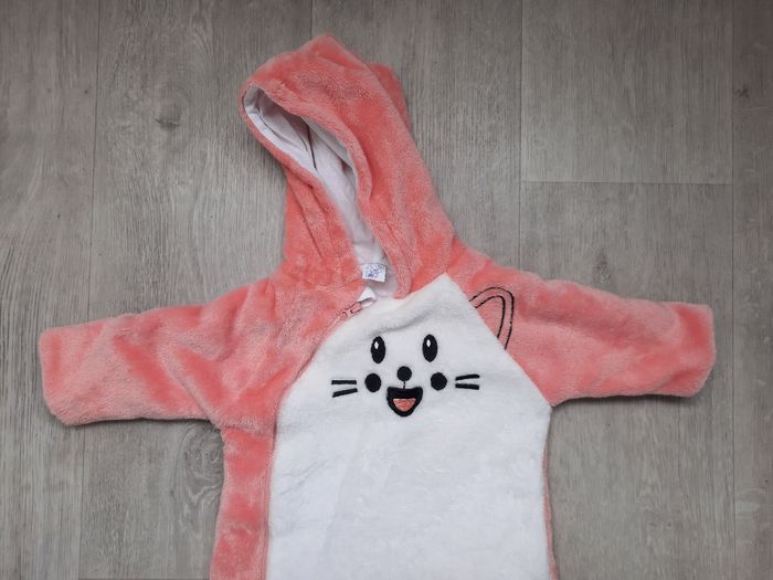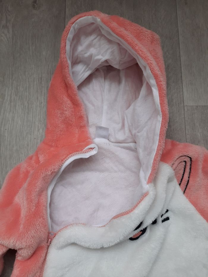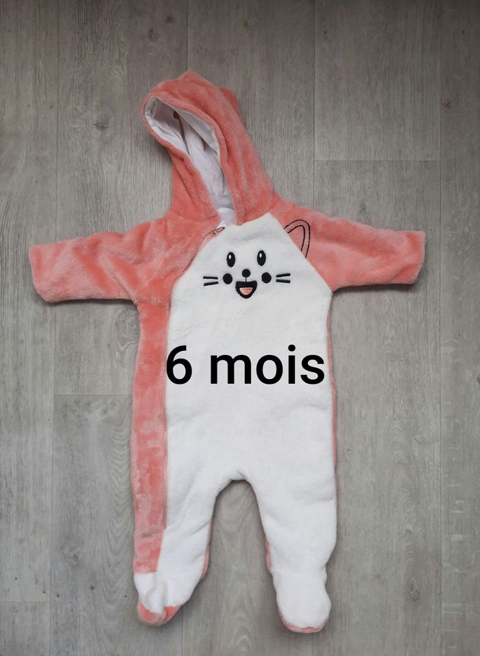 Grenouillère chaude solaire Sur pyjama ou pilou pilou Parfait état servi 1 fois acheté neuf Avec capuche et fermeture éclair Taille 6 mois fille Tout doux et chaud