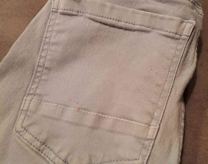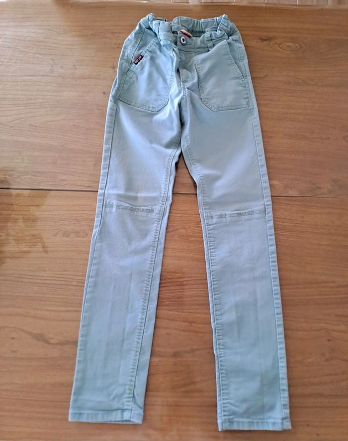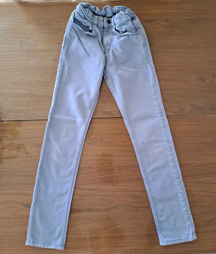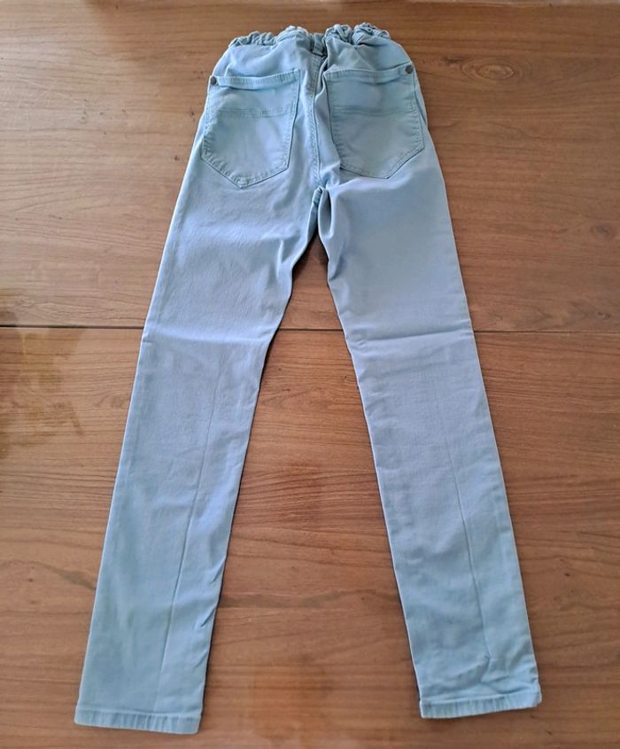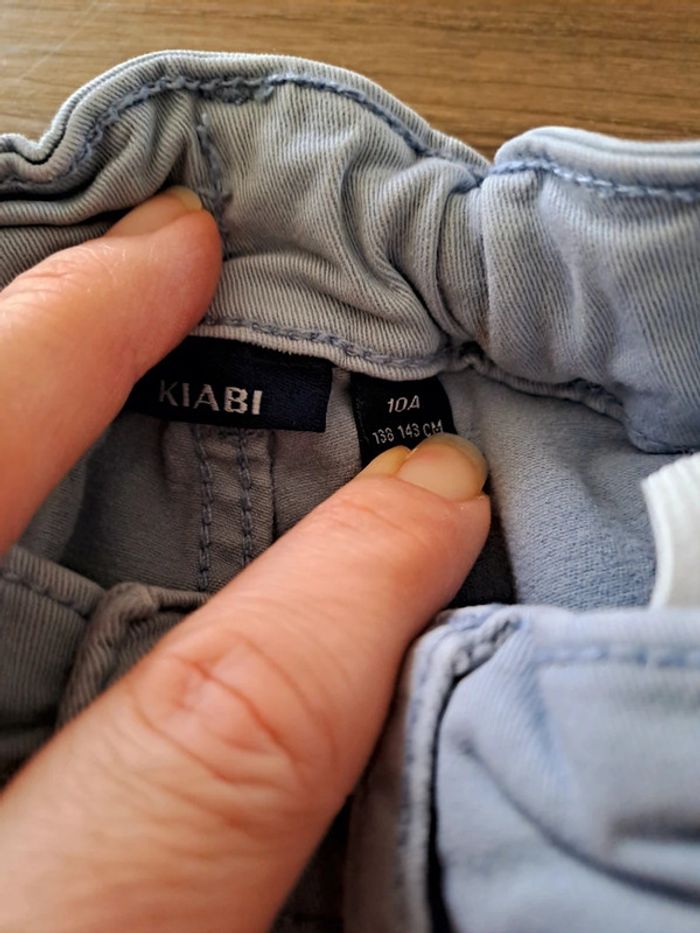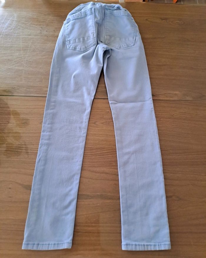 Lot de 2 jeans en taille 10 ans : - 1 jean turquoise clair Tape à l'Oeil ; se resserre à la taille ; genoux très légèrement élimés et 2 traînées blanchâtres sur une jambe (fer à repasser ?) - 1 jean bleu ciel Kiabi ; se resserre à la taille ; genoux élimés ; petites taches aux fesses et sur une jambe #jean10ansgarçon #ciya76vêtementsgarçon10ans