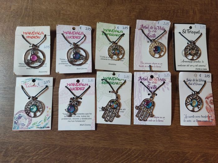 Lot de 10 colliers mandala en espagnol neufs. Mandala espérance, passion, licorne,... Acheté 3,95€/pièce je revends à 2€/pièce ou 20€ le lot.